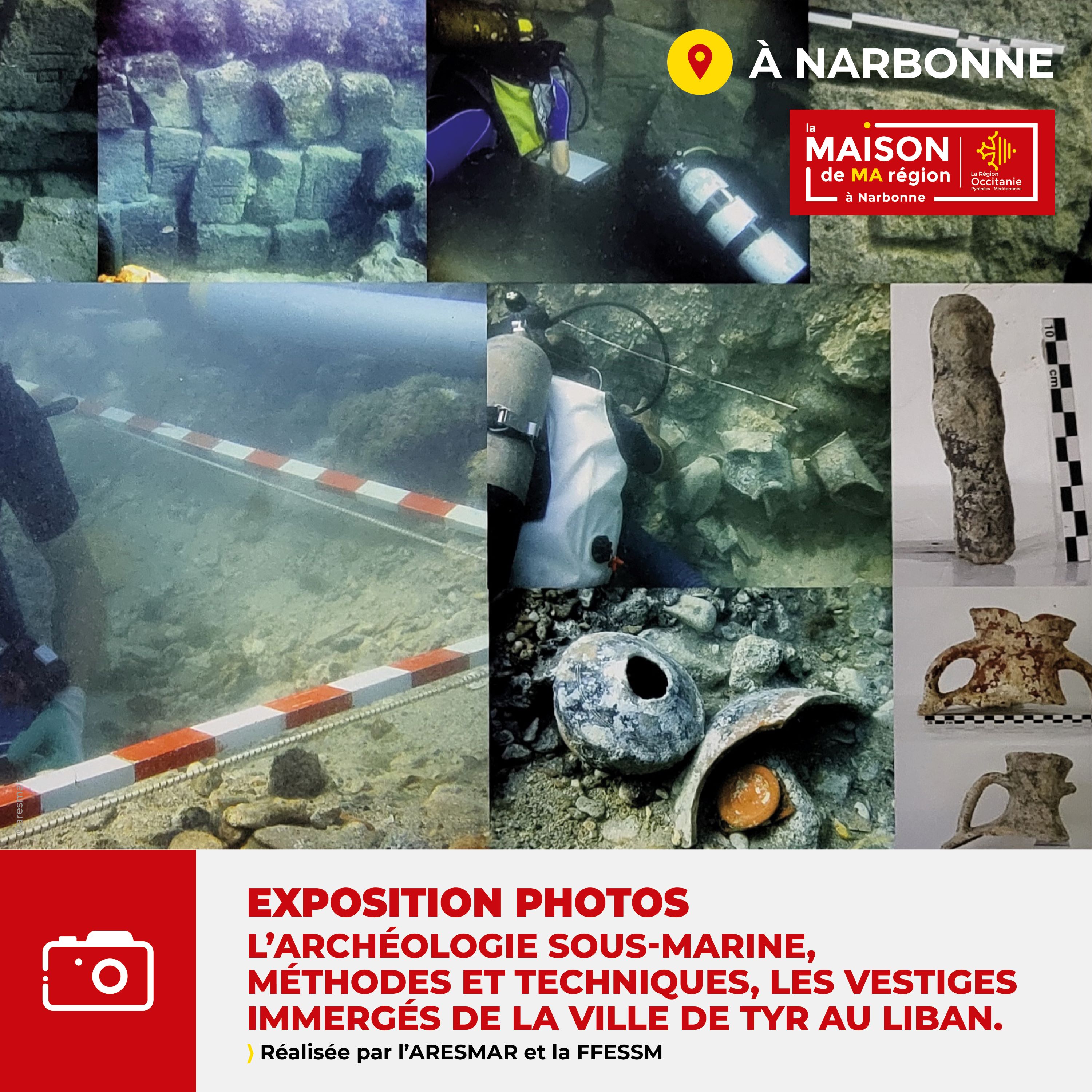 Dans le cadre des Rencontres d’Archéologie de la Narbonnaise 2024, votre Maison de Ma Région à Narbonne vous invite à découvrir l’exposition photos "l’Archéologie sous-marine, méthodes et techniques, les vestiges immergés de la ville de Tyr au Liban, du 1er au 18 octobre 2024, et à son vernissage le mercredi 2 octobre à 12h30.