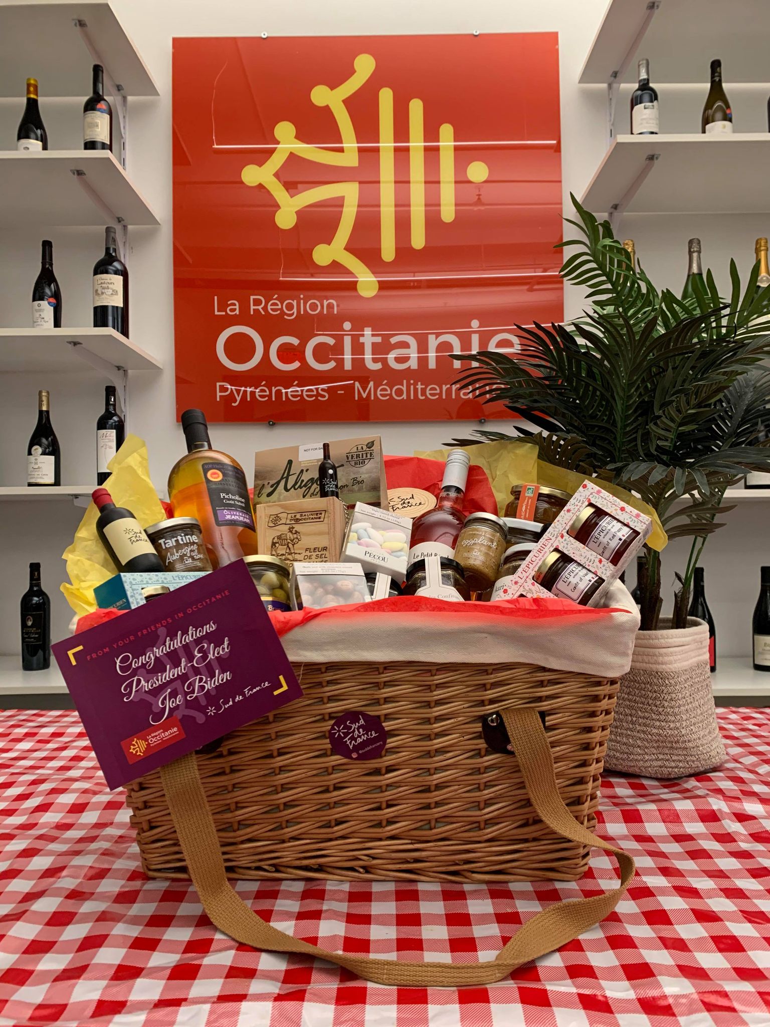 Carole Delga a souhaité appuyer son courrier et sa demande par l’envoi au Président-Elu d’un panier garni composé de produits emblématiques de l’Occitanie : huile d’olive, vin, cassoulet, aligot, confitures, sel de Camargue, tapenades, olives Lusques, soupe de pistou, ratatouille, dragées chocolat et amandes.