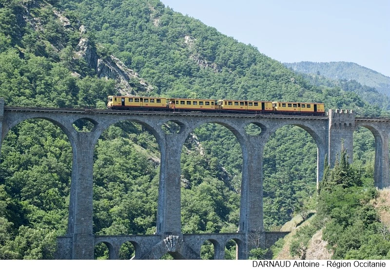 La balade panoramique de 63 km se déroule dans des voitures - certaines découvertes - d’un train fonctionnant à l’énergie verte, produite par le barrage des Bouillouses. La ligne culmine à Bolquère à 1592 mètres d’altitude, la plus haute gare de France. Jalonnée de 650 ouvrages d’art dont 19 tunnels, le viaduc Séjourné et le pont Gisclard (dernier pont suspendu ferroviaire de France) pour relier une vingtaine de gares, la ligne est une vraie prouesse technique.