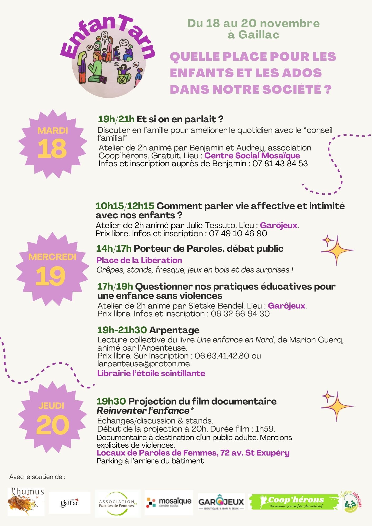 Conseil familial, porteur de paroles, ateliers sur les Violences Éducatives Ordinaires, sur la vie affective, un arpentage, la projection de « Réinventer l’enfance » un film documentaire réalisé par Ève Simonet…