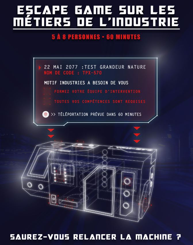 Soutenu par la Région Occitanie, l’Escape Game téléportation est un moyen ludique et interactif de faire découvrir l’Industrie et ses métiers aux personnes en reconversion ou réorientation professionnelle et aux demandeurs d’emploi curieux d’en apprendre davantage sur le secteur.