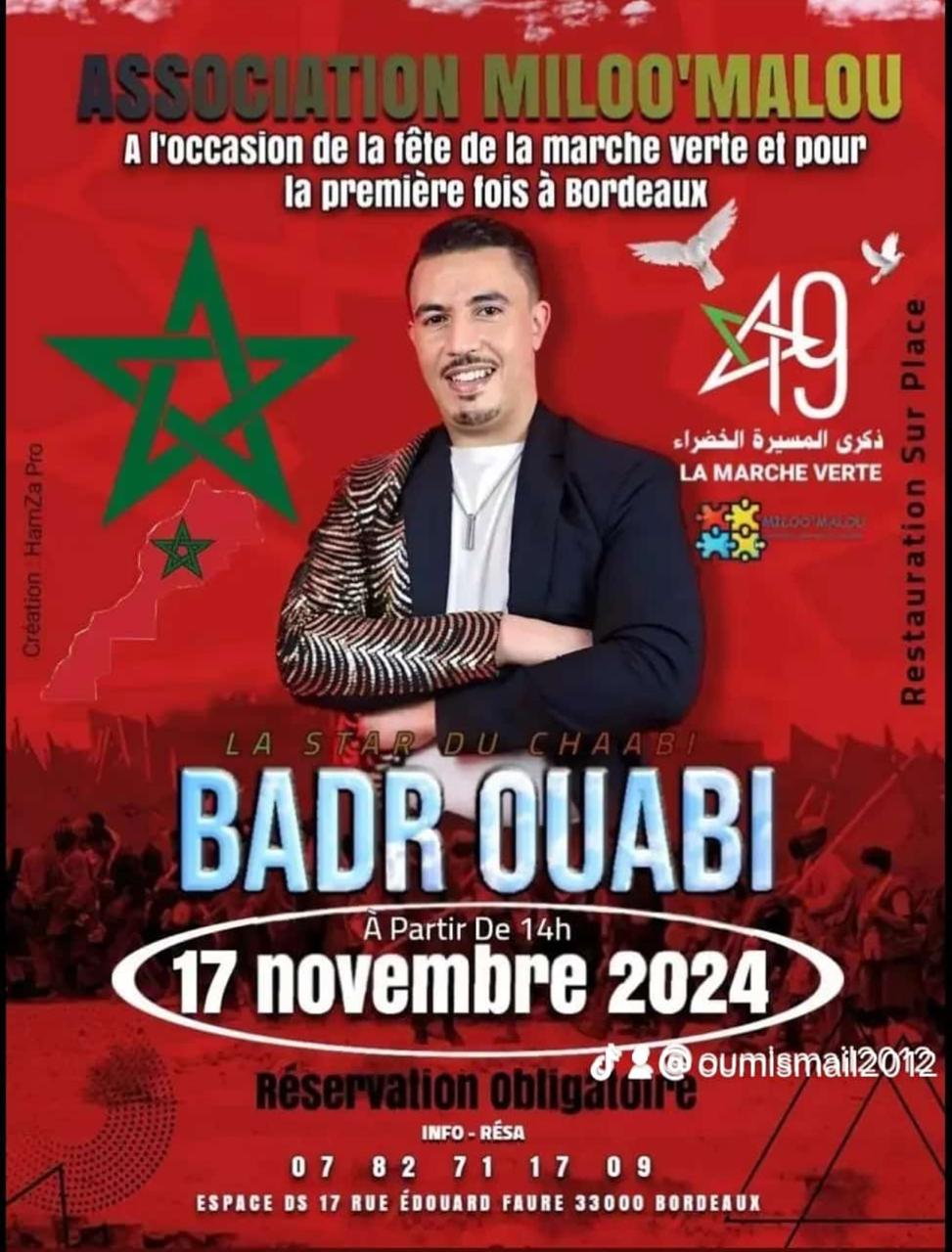 À l’occasion de la Fête de la Marche Verte, nous vous invitons à un événement unique, en compagnie de Badr Ouabi, la star incontournable du chaâbi, pour la première fois à Bordeaux.