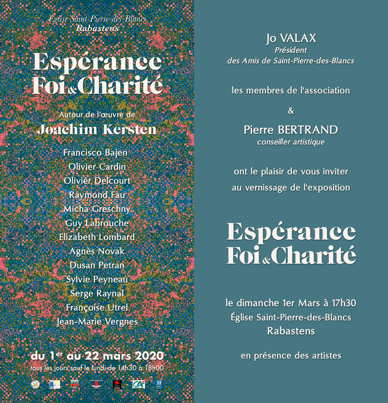 L’exposition qui débute le 1er mars rassemble les œuvres de ces artistes autour d’une installation qui veut refléter cette trilogie de la foi chrétienne : Espérance Foi et Charité. Une œuvre où chacun peut pénétrer, enveloppé d’espérance, où ruisselle charité, et où la foi domine l’ensemble.