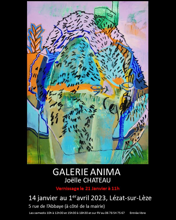 Exposition de Chateau Joëlle Galerie Anima du samedi 14 janvier au 1er avril 2023. Les horaires d’ouverture sont le samedi de 10h à 12h 30 et après-midi de 15h 30 à 18h 30 sur RV au 06.78.54.75.67.