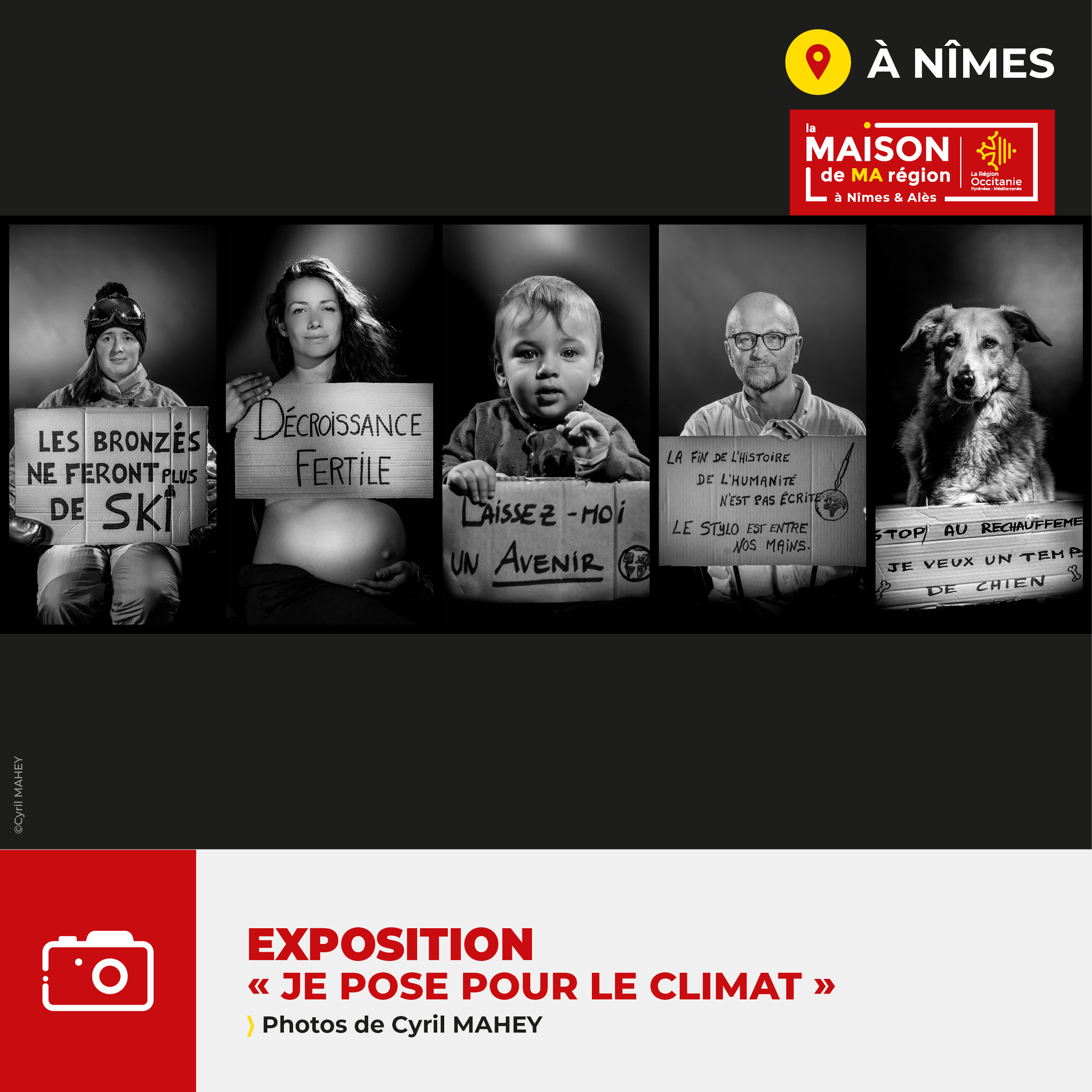 La Maison de Ma Région à Nîmes organise, du 10 au 28 juin, une exposition photos intitulée " Je pose pour le climat" de Cyril MAHEY, proposée le collectif CITOYENS POUR LE CLIMAT. Elle est gratuite et ouverte tous les jours sauf le week-end aux horaires d’ouverture de la Maison de ma Région, 3 place des arènes.