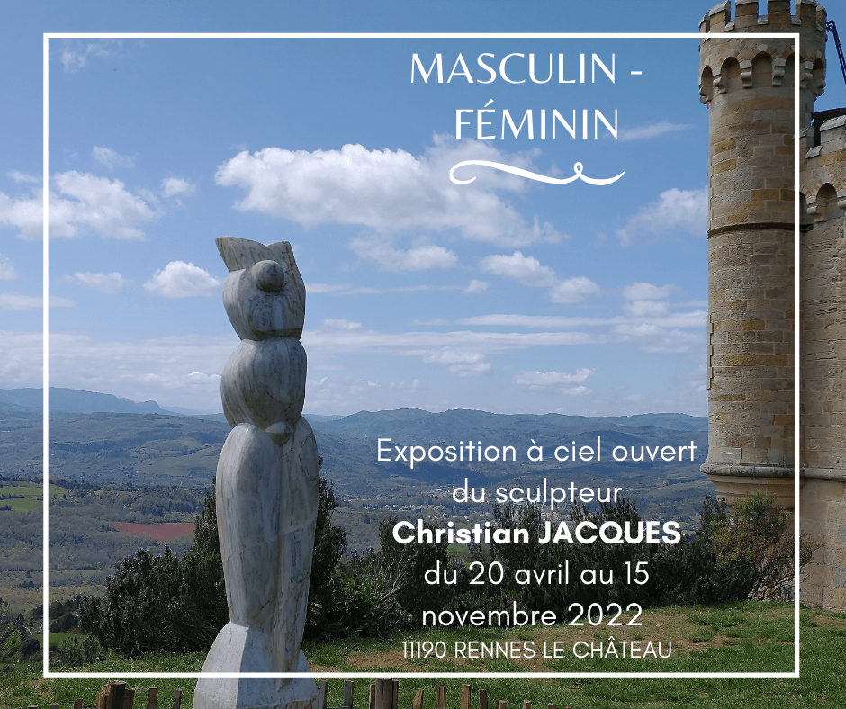 L’exposition “Masculin- Féminin” présente les silhouettes de marbre du sculpteur CHRISTIAN JACQUES et traduit la créativité de l’artiste sur le thème du corps féminin, du couple et de leur alchimie . Venez ressentir les énergies féminines et amoureuses au point culminant de Rennes le château dans un cadre magique !