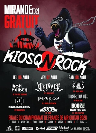 Avoir cette FINALE du championnat de France de Air Guitar à Mirande dans le Gers est donc une fierté. Kiosqnrock c’est du Air Guitar, des concerts, des stands rock, un blind test géant : de l’inédit, du fun, de la culture, et de la bonne bouffe. En 2022, notre festival prend un rayonnement médiatique national, puis international : nous sommes devenus champion du monde à Oulu en aout 2022 ! La consécration qui l’aurait cru !!