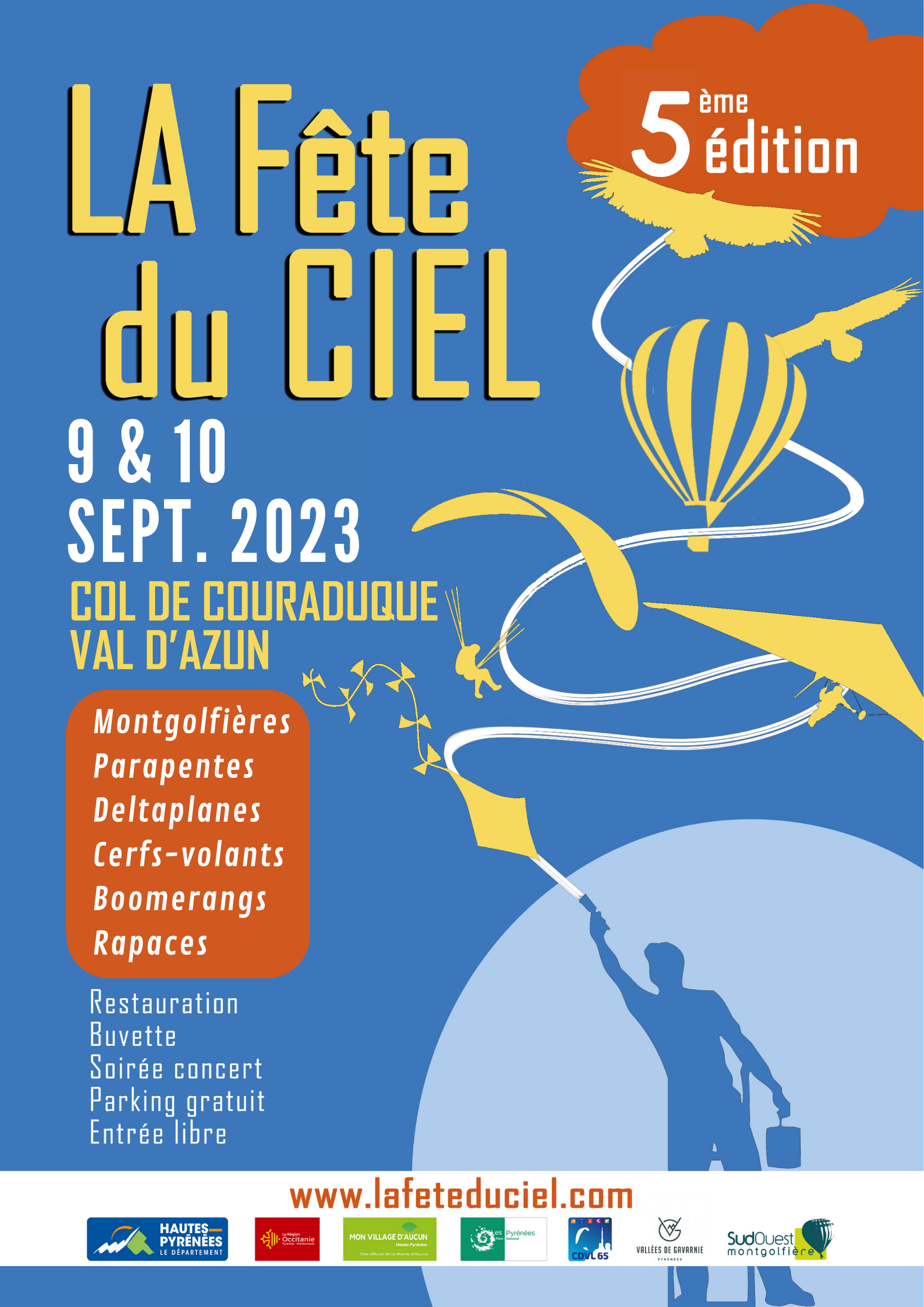 Ce sera la 5ème édition de la Fête du ciel, au col de Couraduque en Val d’Azun les 9 et 10 septembre 2023. Se retrouver pour voler, planer, virevolter, observer, contempler… et respirer au grand air ! Le temps d’un week-end, cet évènement vous invite à lever les yeux au ciel – ou d’avoir les pieds dans le vide pour les amateurs de sensations fortes – et profiter du magnifique cadre du Val d’Azun, entre le village d’Aucun et le col de Couraduque. La fête du ciel c’est le vol libre en lien avec la beauté des paysages, le respect de la nature, le vol des rapaces… La Fête du ciel s’adresse à tous en accès libre. De nombreux ateliers sont proposés pour petits et grands : ateliers de fabrication de cerfs-volants, stands de démonstration et découvertes, observations des rapaces, spectacle, projections, des conférences… Sans oublier le matin vers 8h00 le spectacle grandiose des montgolfières.