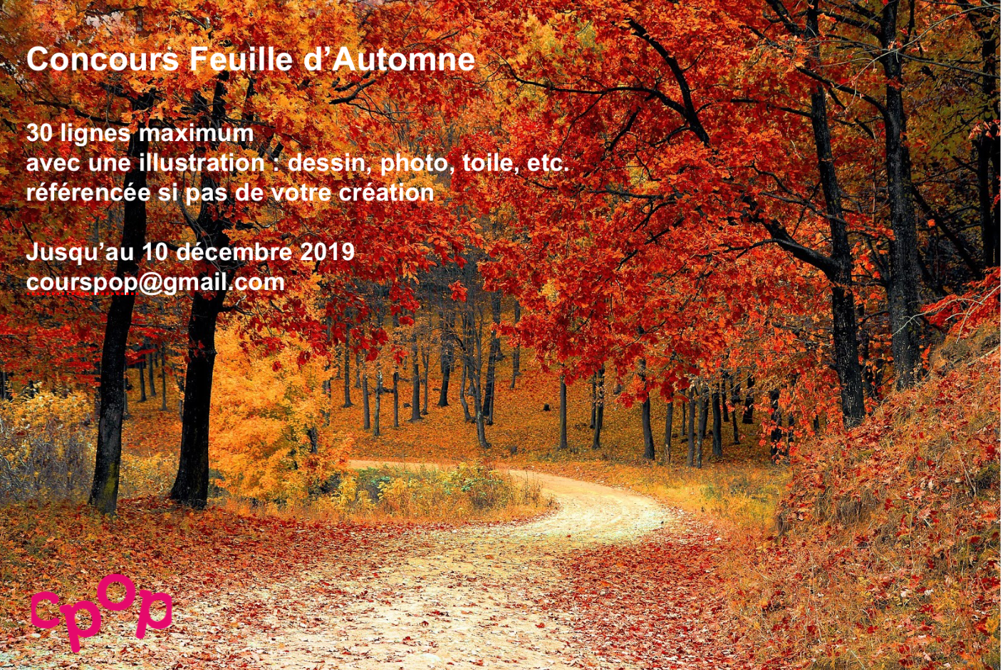 Pour cette quatrième édition du concours Feuille d’Automne, cpop vous propose de rédiger une feuille de 30 lignes maximum comme d’habitude, accompagnée cette fois d’une illustration de votre création ou pas : dessin, photographie, toile, etc. Si pas de votre création, préciser l’auteur.e. 30 lignes maximum… donc : moins c’est possible, plus ça ne le fait pas !