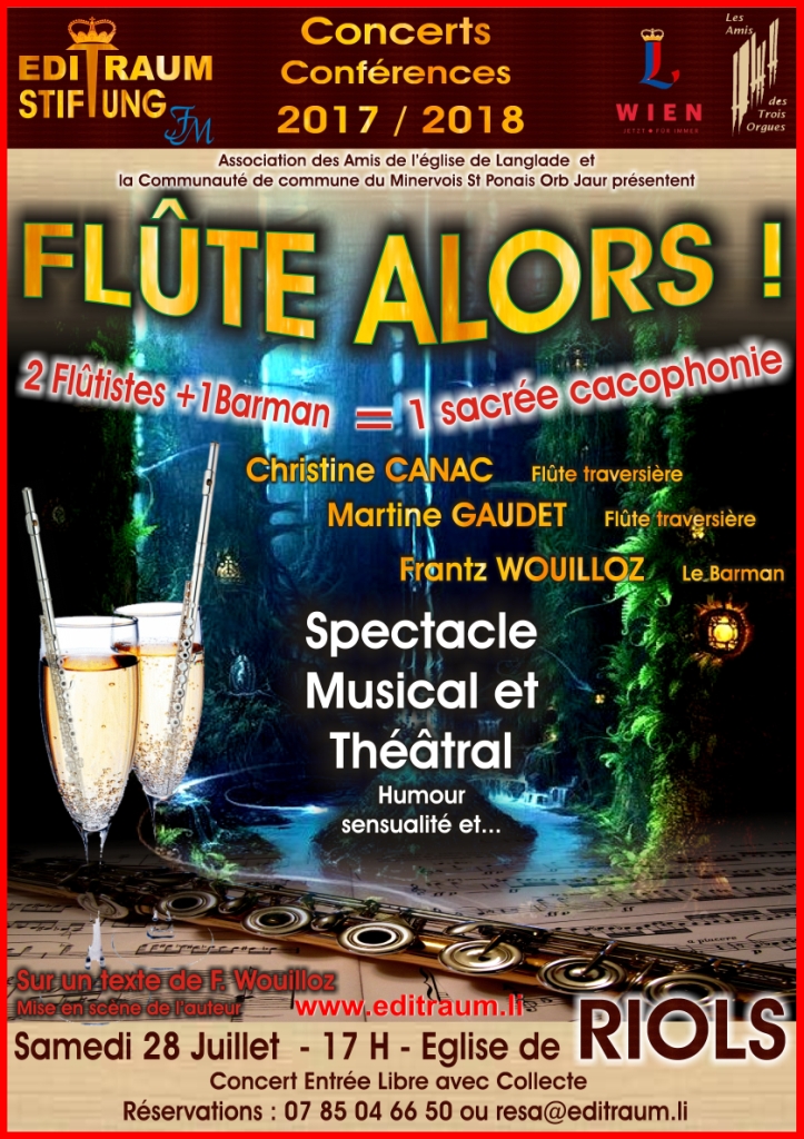 Ce spectacle qui met en valeur deux talentueuses artistes est avant tout un grand moment plein d’humour où les jeux de mots ancestraux que génère cet instrument vous emmènent dans un monde de l’absurde. Avec Christine Canac et Martine Gaudet aux Flûtes Traversières et Frantz Wouilloz-Boutrois dans le rôle du barman. Spectacle pour petits et grands. Ce spectacle vous est proposé par l’Association « les Amis de Langlade » avec le soutien de la Communauté des communes du Minervoix au Caroux et le département de l’Hérault en partenariat avec la Fondation Editraum.