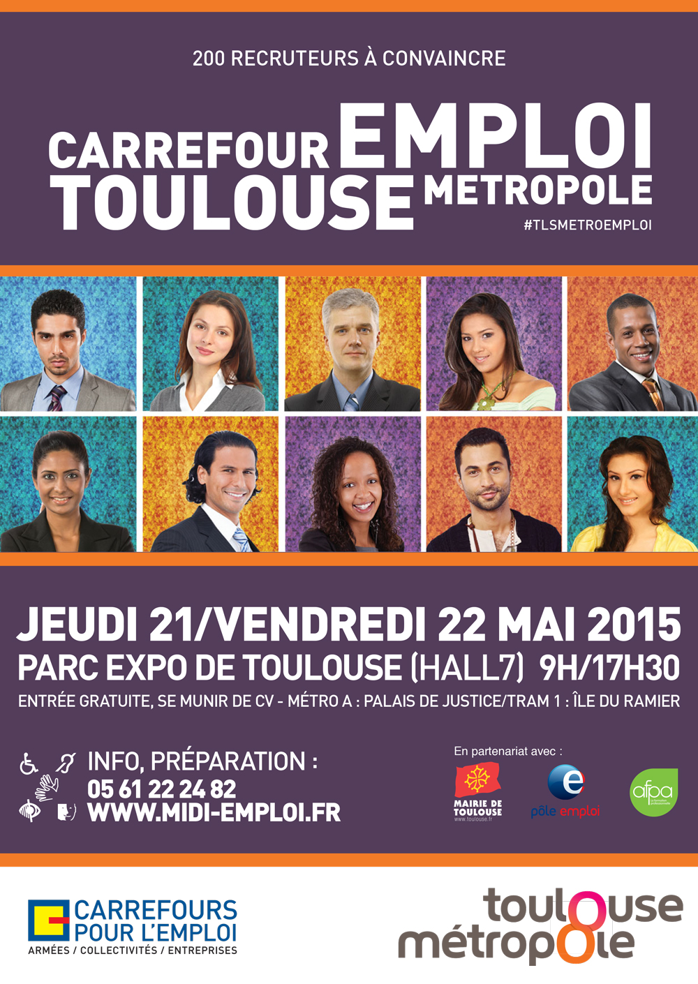 Toulouse Métropole et Carrefours pour l’Emploi proposent les jeudi 21 et vendredi 22 mai 2015, de 9 h à 17 h 30, le forum emploi/formation "Carrefour Emploi Toulouse Métropole" au parc des expositions de Toulouse (Hall 7).