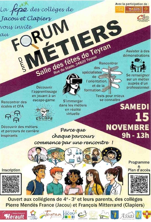 Ouvert aux collégiens de 4è - 3è et leurs parents, des collèges Pierre Mendès France (Jacou), et François Miterrand (Clapiers).