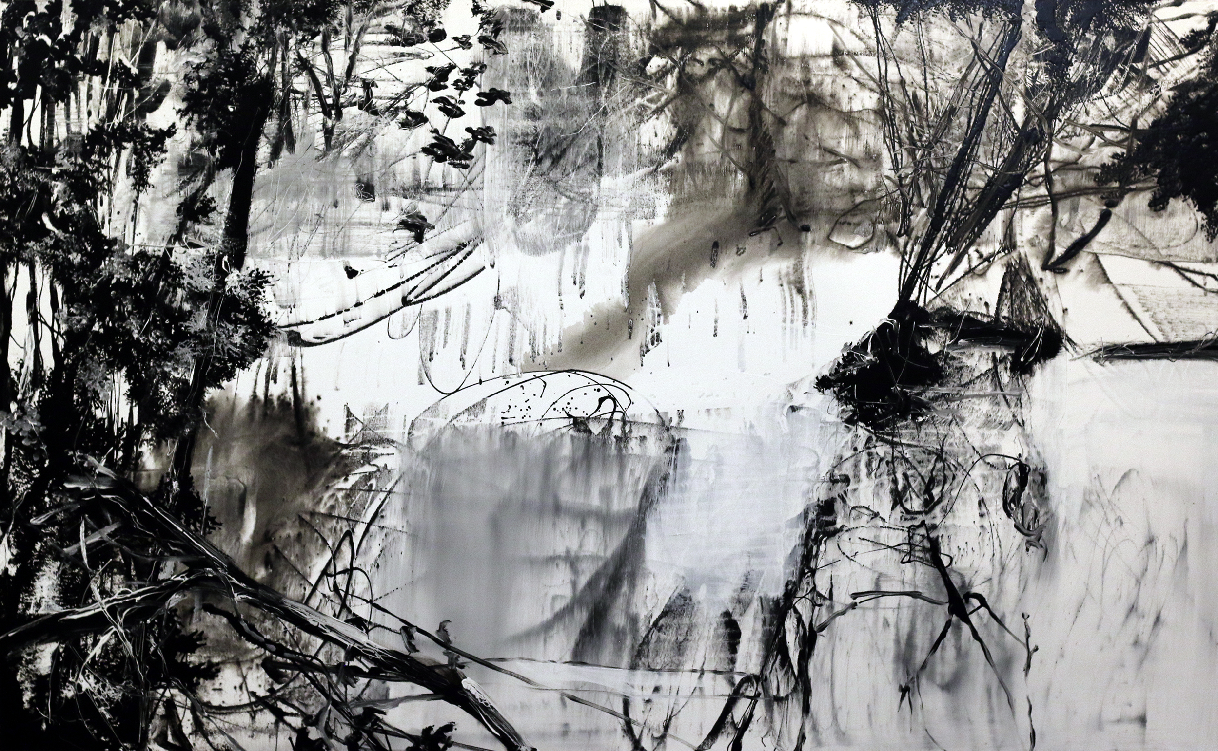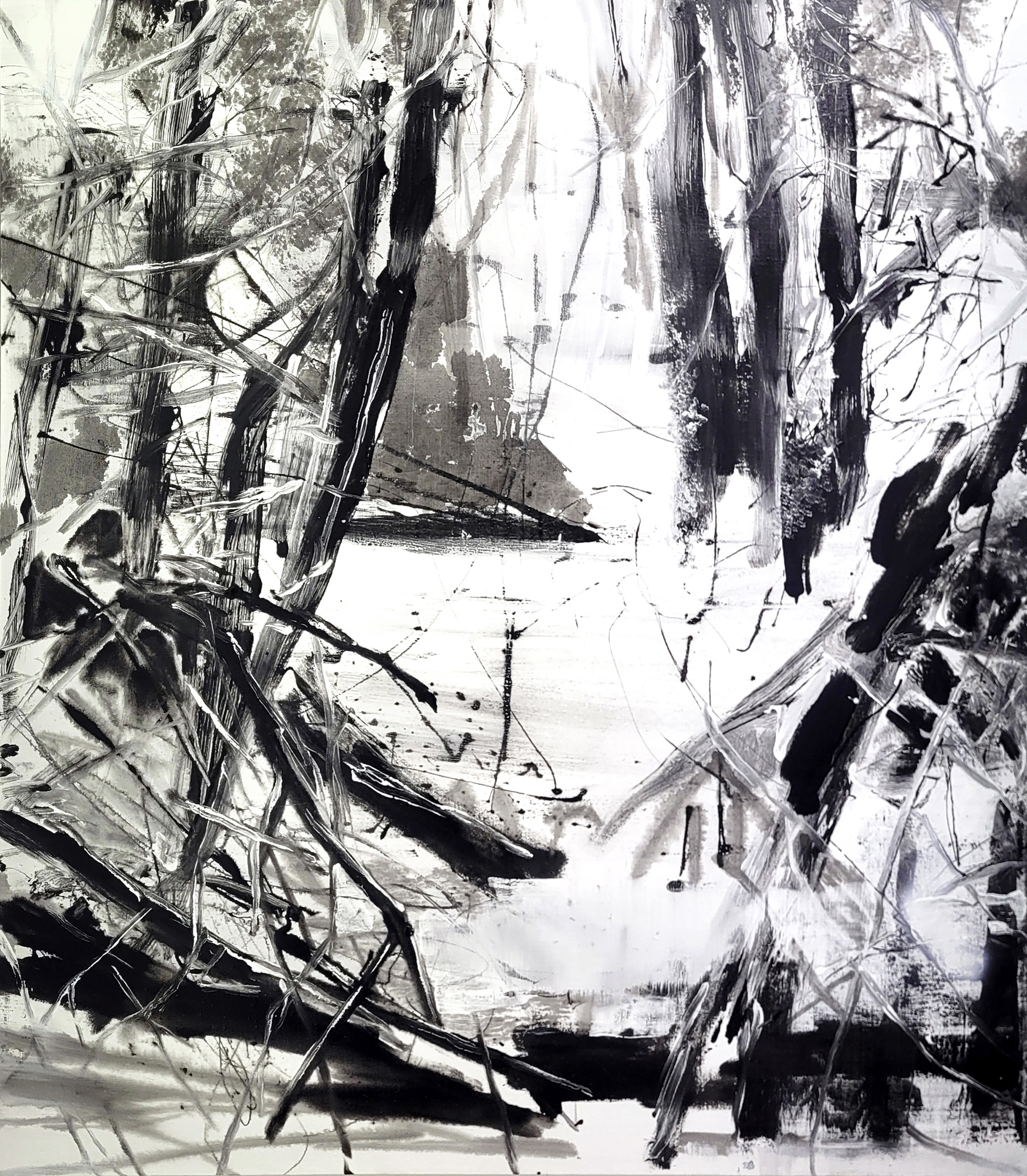 Frédéric Fau cultive une certaine forme d’ascèse. Minimal dans ses couleurs, économe dans ses outils, classique dans le choix des supports, il n’a sur son lieu de travail que peu d’exigence, celle de pouvoir poser ses toiles et ses pinceaux. Comme il travaille beaucoup au sol (un autre point commun avec Pollock), si le lieu est grand, le format des toiles pourra l’être aussi.