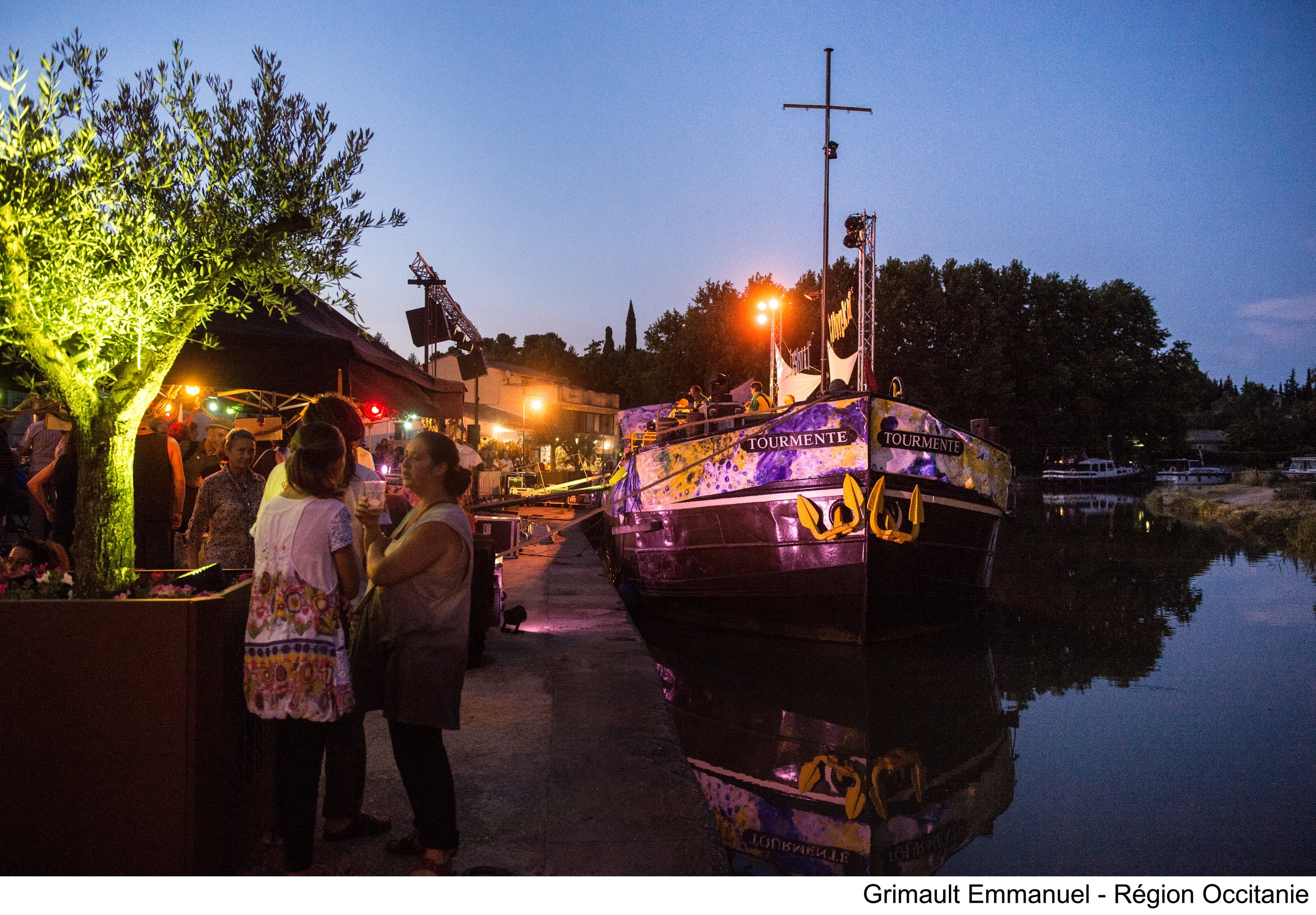 La première image que l’on découvre, c’est cet immense bateau, sorti d’un autre temps, transformé en scène de concerts. Le « Tourmente » est la toute dernière péniche de commerce à encore naviguer sur le Canal du Midi, la mythique voie de communication creusée par Riquet aux temps du Roi Soleil (XVIIe siècle) pour relier Méditerranée et Atlantique .