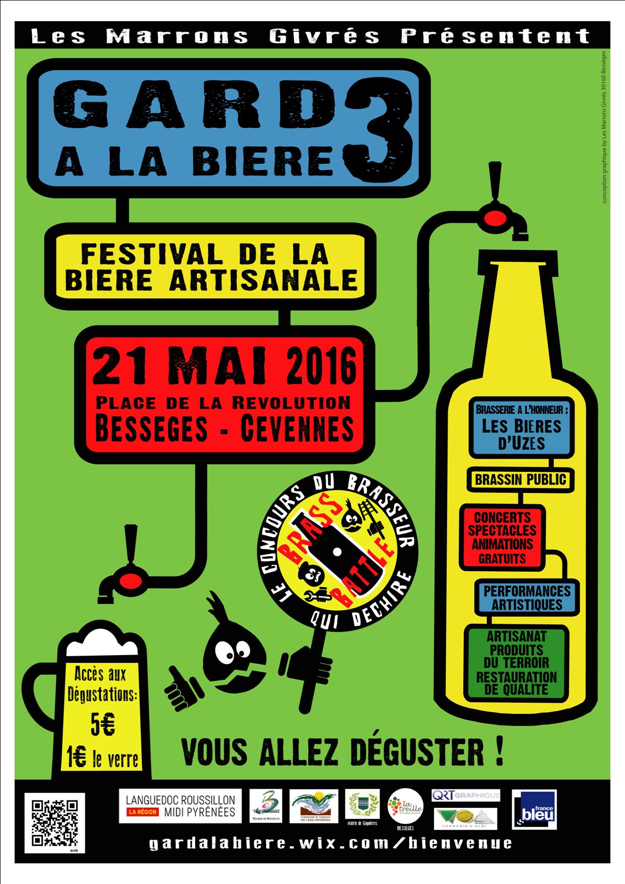 Festival de dégustation de bières artisanales. 23 brasseries artisanales seront présentes le samedi 21 mai 2016, dont 10 brasseries primées lors de la première édition du "Brass Battle, le concours du brasseur qui déchire". Le jury remettra les prix tout au long de la journée. Gard à la bière, c’est aussi :