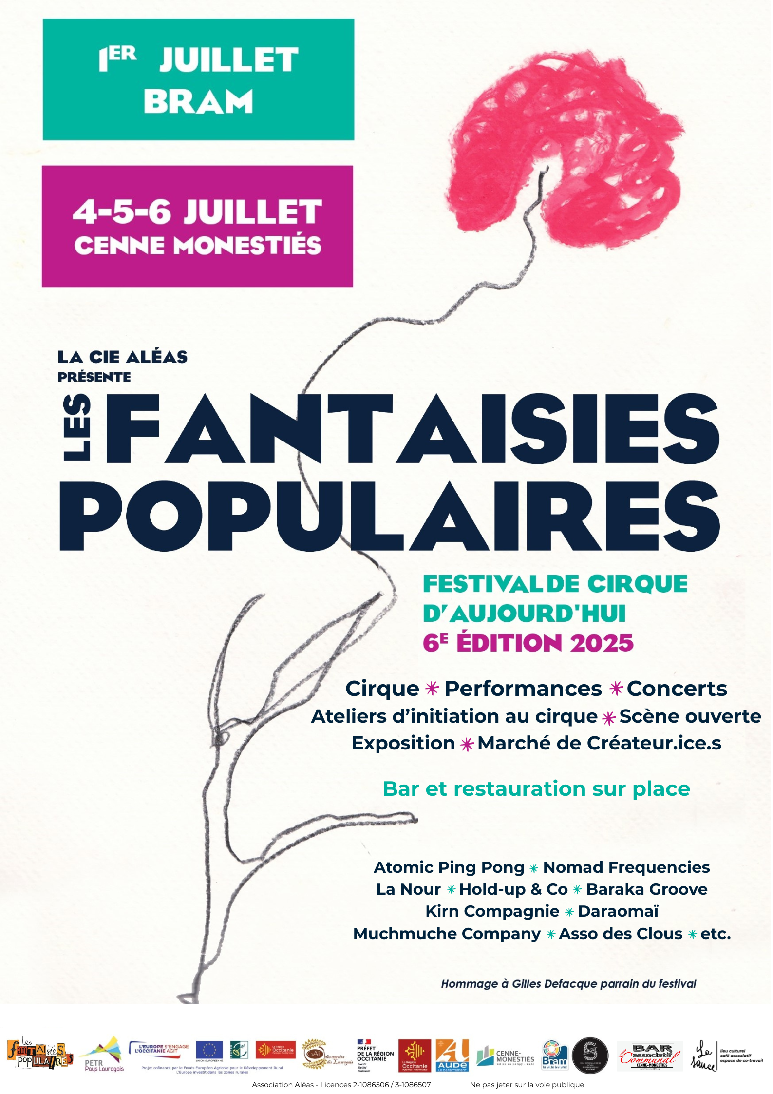 Le 1er juillet à Bram et du 4 au 6 juillet 2025 à Cenne-Monestiés aura lieu la 6ème édition des Fantaisies Populaires, un festival ce cirque d’aujourd’hui, organisé par la Compagnie Aléas.