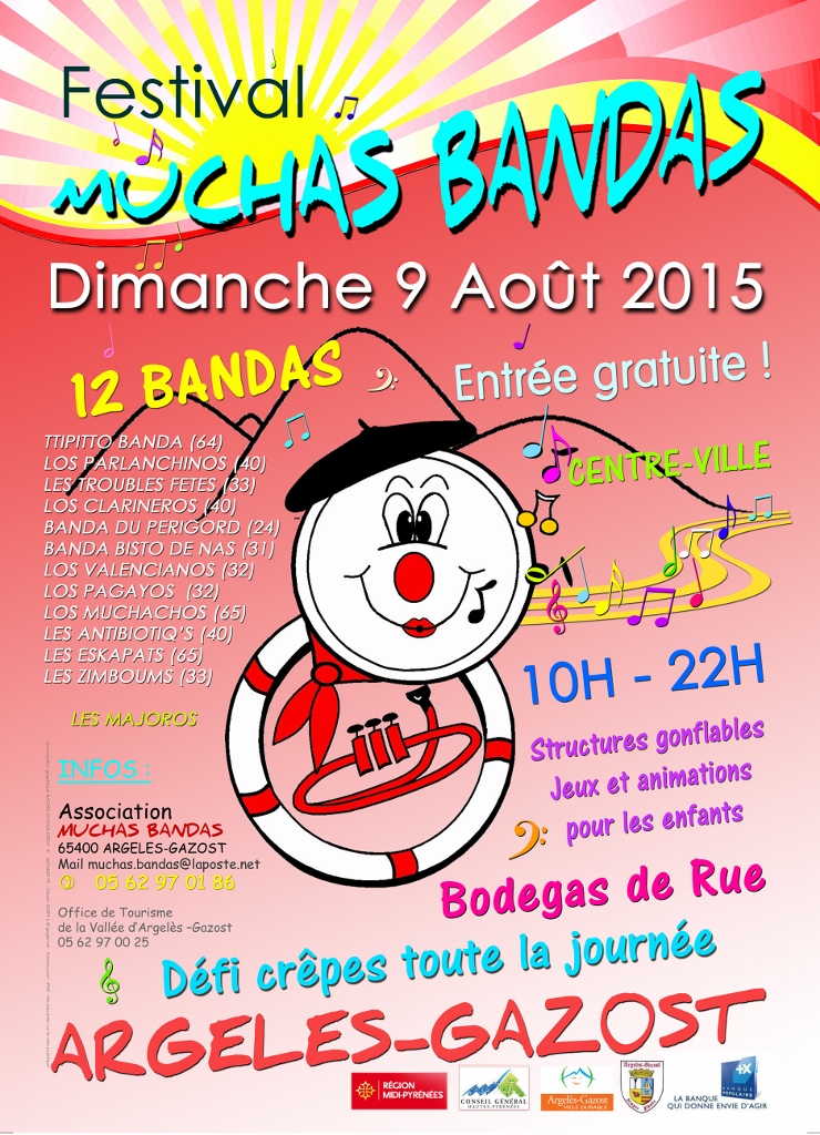 MUCHAS BANDAS est un festival de 12 Bandas (orchestres de rue traditionnels et festifs du Sud-Ouest), qui a lieu, le Dimanche 9 Août 2015, à Argelès-Gazost (65 – Hautes-Pyrénées), en plein cœur du Pays des Gaves.