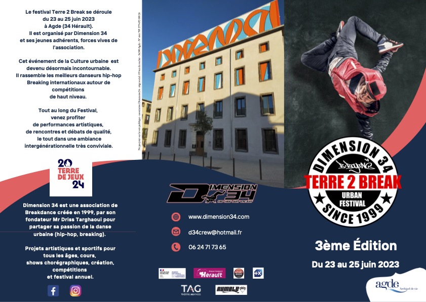 Nous sommes ravis de vous inviter à la 3e édition du Festival "Terre 2 Break" festival urbain dédié à la culture urbaine et plus particulièrement à la danse Hip hop Breakdance, discipline nouvellement arrivée aux Jeux Olympiques Paris 2024.