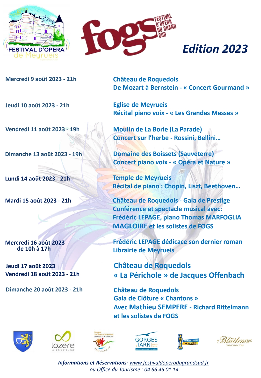 Festival d’arts Lyriques qui s’étend sur 11 jours, dont le coeur du spectacle se situe à Meyrueis en sud Lozère, avec des escapades dans tout le département. Au coeur du spectacle, la Périchole d’Offenbach les 17 et 18 août au chateau de Roquedols à Meyrueis.