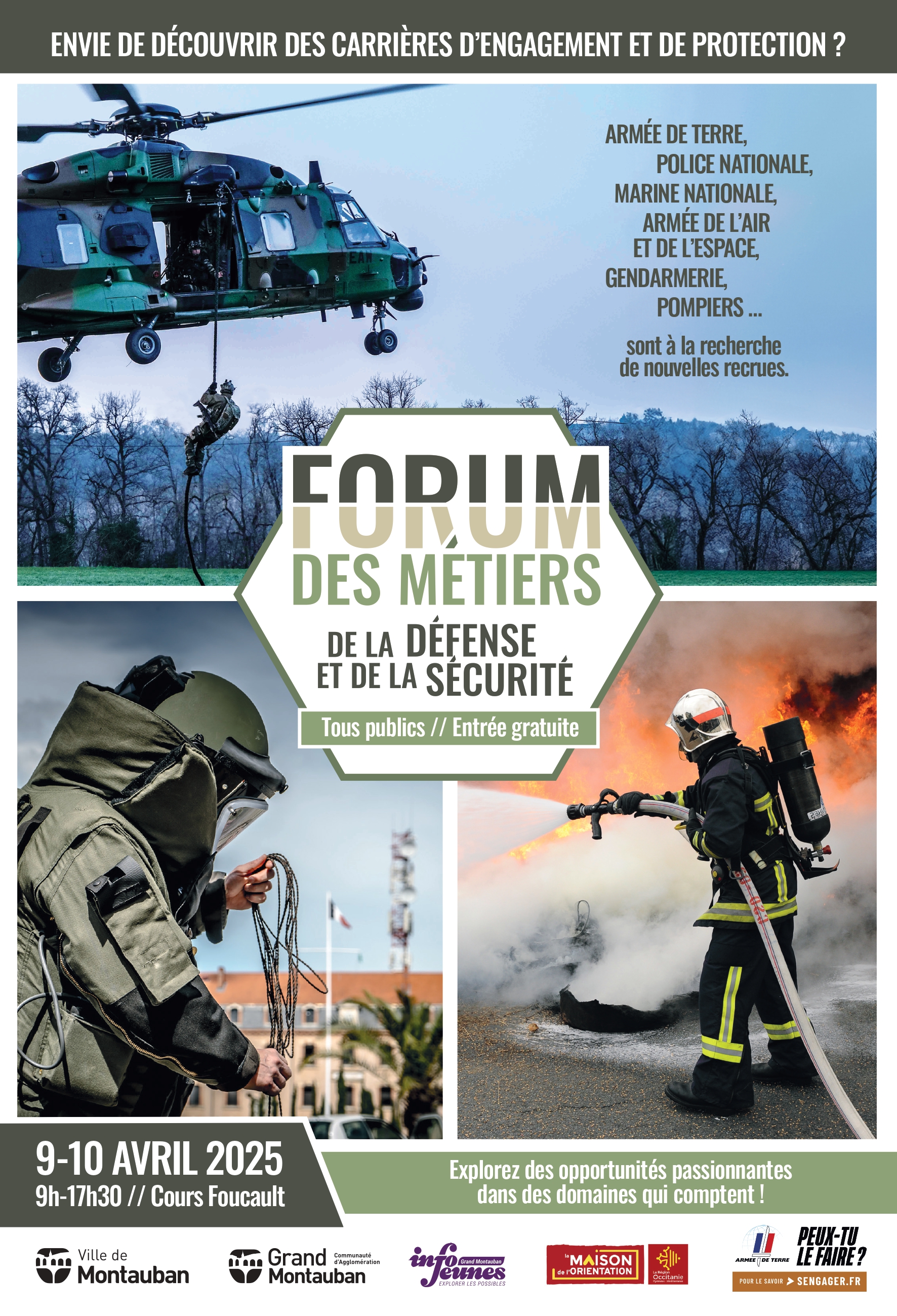 Forum consacré à la découverte des métiers de la Défense et de la Sécurité les mercredi 9 et jeudi 10 avril 2025 de 9h à 17h30 au « Cours Foucault » à Montauban.