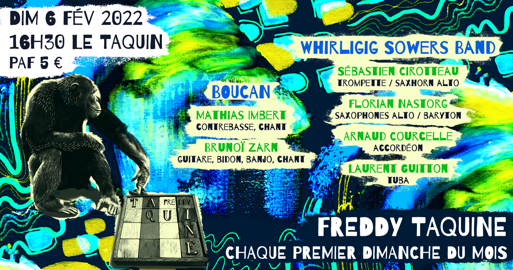 Freddy Taquine est un rendez-vous régulier à Toulouse à l’initiative des artistes du collectif Freddy Morezon et du Taquin, le 1er dimanche de chaque mois. Conçu comme un laboratoire, ce rendez-vous mensuel est l’occasion de concerts mais aussi d’expériences et de rencontres inédites, entre les musiciens, entre les musiques, entre les arts… C’est aussi l’occasion d’inviter des amis de collectifs pas si lointains, artistes-chercheurs, musiciens, bien sûr, mais aussi vidéastes, graphistes, plasticiens, danseurs… Mélanger les genres, les gens, et observer si la magie opère…