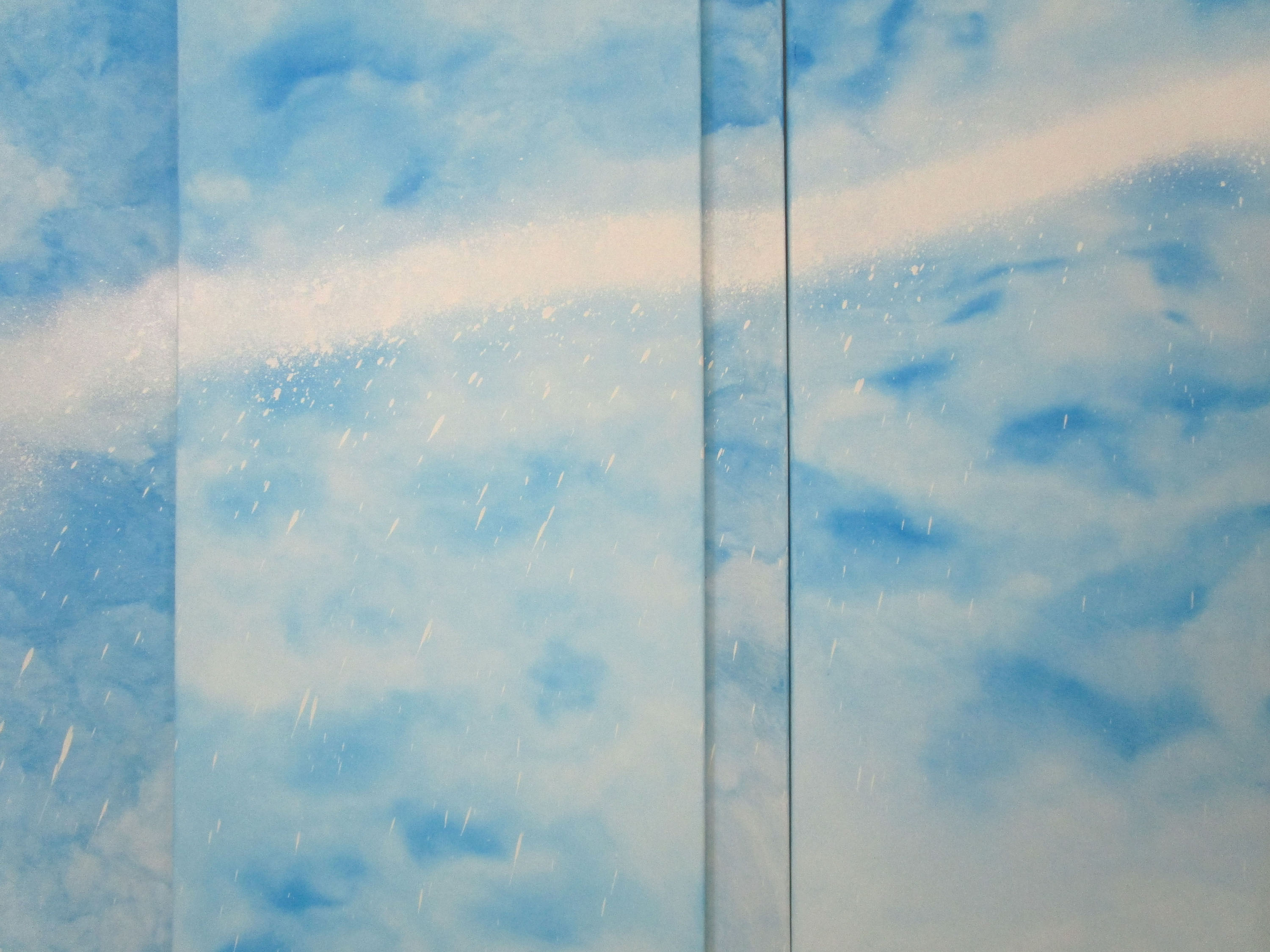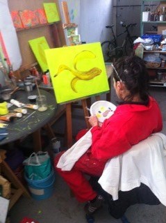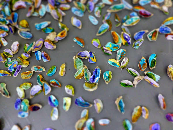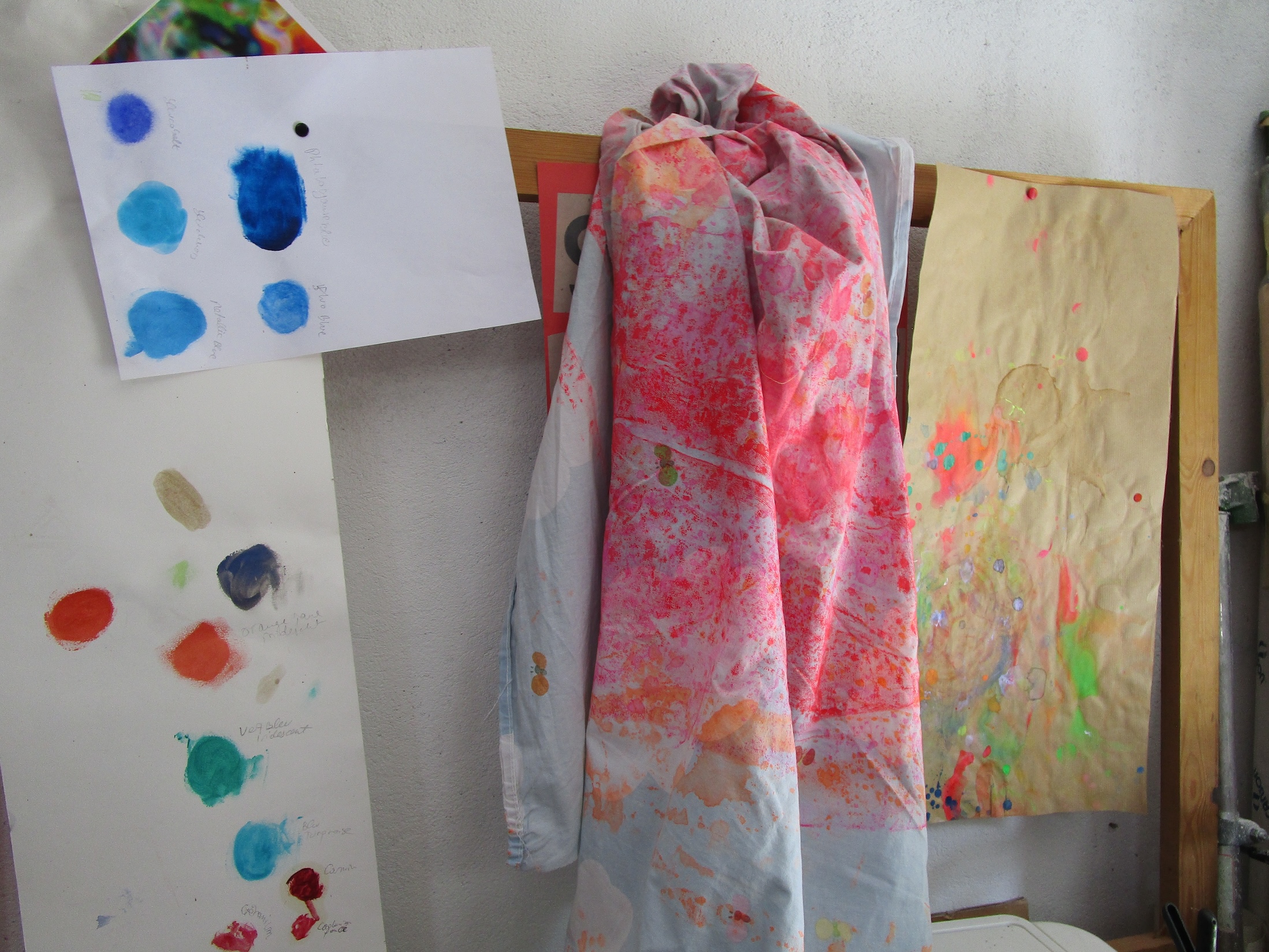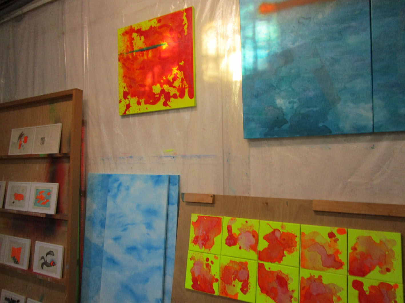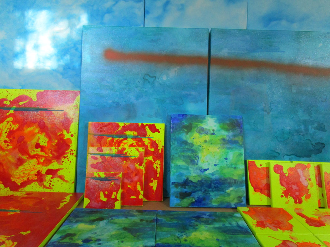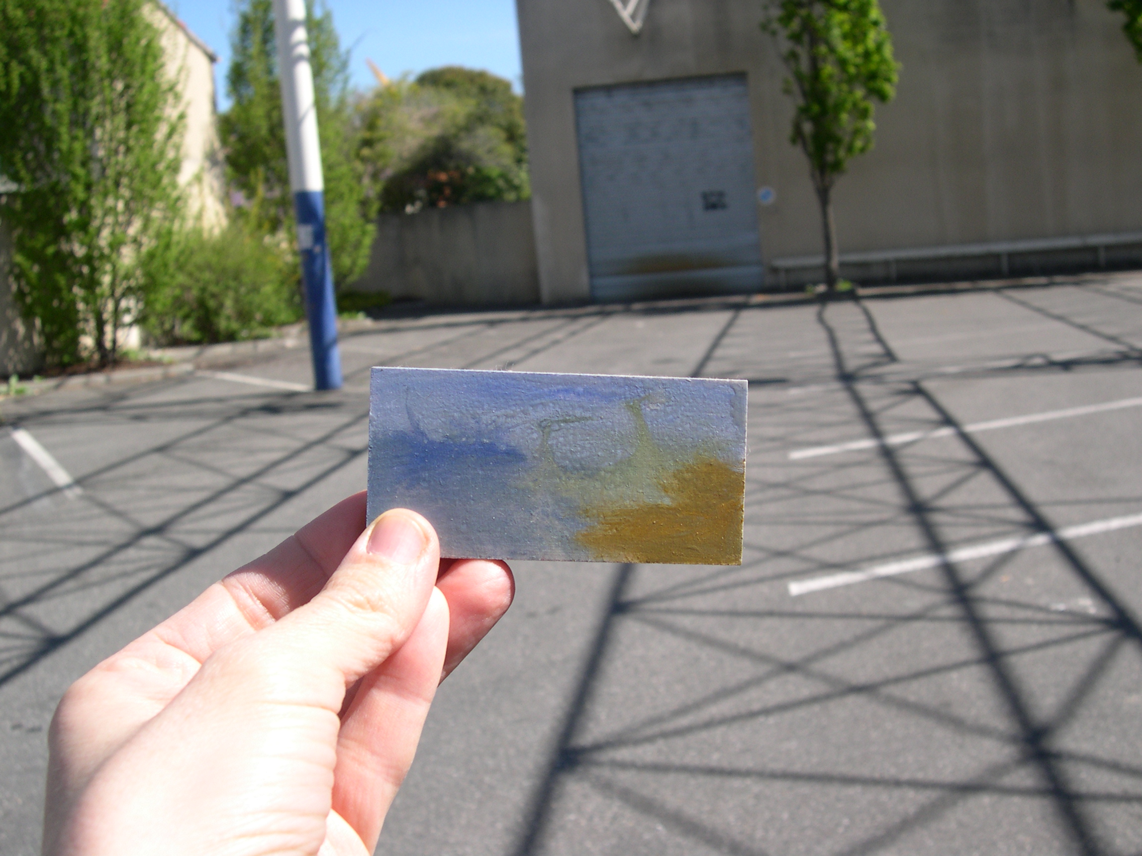 Ceci peut faire sourire, comme un défi malicieux à l’élégance. Je mélange ainsi différents registres de peinture et de langage : peinture à l’huile en glacis et paillettes, acrylique très diluée et peinture en bombe pour le geste, harmonies délicates et couleurs fluorescentes ou saturées, étymologies compliquées et expressions familières.