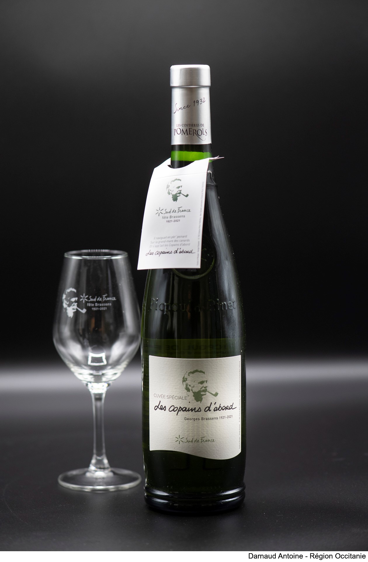 « Mes parents ont dû me trouver au pied d’une souche et non dans un chou », disait Georges Brassens, en 1957, dans sa chanson « Le vin ». Pour fêter les cent ans du poète, la cave coopérative de Beauvignac-Pomérols a produit, pour la marque régionale Sud de France, une cuvée spéciale baptisée « Les copains d’abord », avec sur l’étiquette la pipe et la moustache de Georges. Cette cuvée, 2020 en appellation Picpoul de Pinet, est produite en édition limitée. Elle est commercialisée au prix de 10€ directement à la coopérative. En accord avec la chanson, c’est un véritable hymne à l’amitié et à l’art de vivre du sud.