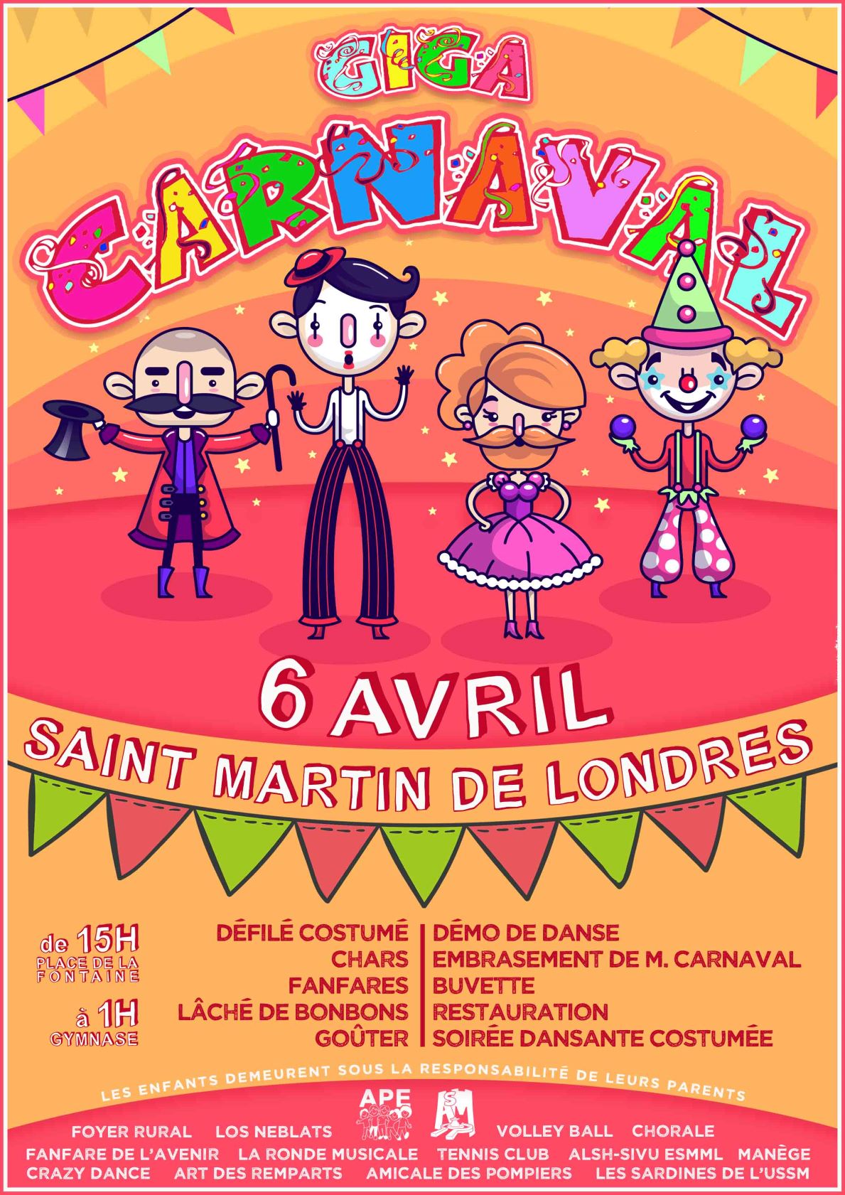 L’Association des Parents d’élèves et l’Animation Saint-Martinoise vous convient avec la fanfare Los Neblats, la Fanfare de l’avenir, l’Amicale des pompiers, le Foyer rural, la section Volley Ball du Foyer rural, les sardines de l’USSM, La Ronde musicale, le Tennis club, l’ALSH-SIVU ESMML, Crazy Dance et Arts des Remparts à un Giga Carnaval pour petits et grands au bénéfice des enfants des écoles de Saint-Martin-de-Londres et du Mas-de-Londres.