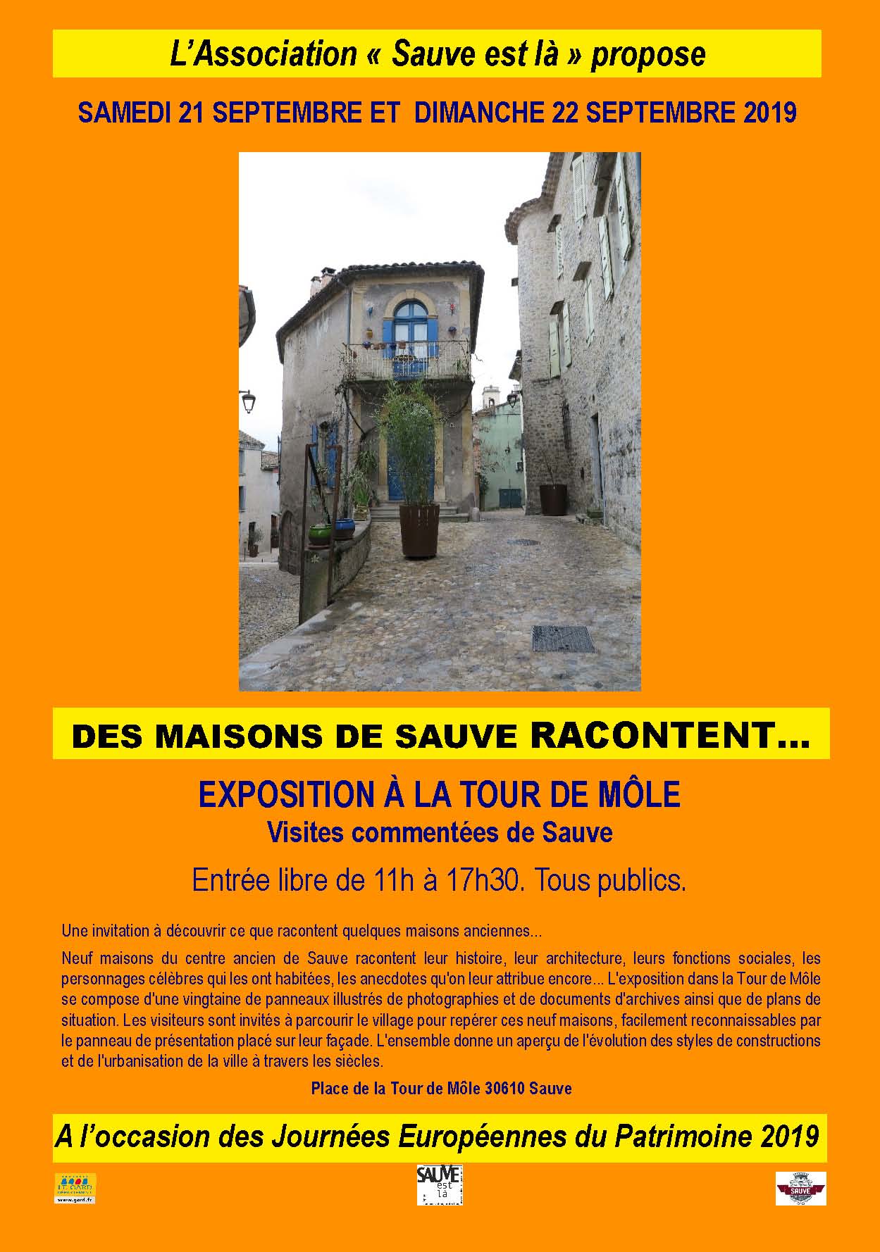 Une invitation à découvrir ce que racontent quelques maisons anciennes… Neuf maisons du centre ancien de Sauve racontent leur histoire, leur architecture, leurs fonctions sociales, les personnages célèbres qui les ont habitées, les anecdotes qu’on leur attribue encore… L’exposition dans la Tour de Môle se compose d’une vingtaine de panneaux illustrés de photographies et de documents d’archives ainsi que de plans de situation. Les visiteurs sont invités à parcourir le village pour repérer ces neuf maisons, facilement reconnaissables par le panneau de présentation placé sur leur façade. L’ensemble donne un aperçu de l’évolution des styles de constructions et de l’urbanisation de la ville à travers les siècles.
