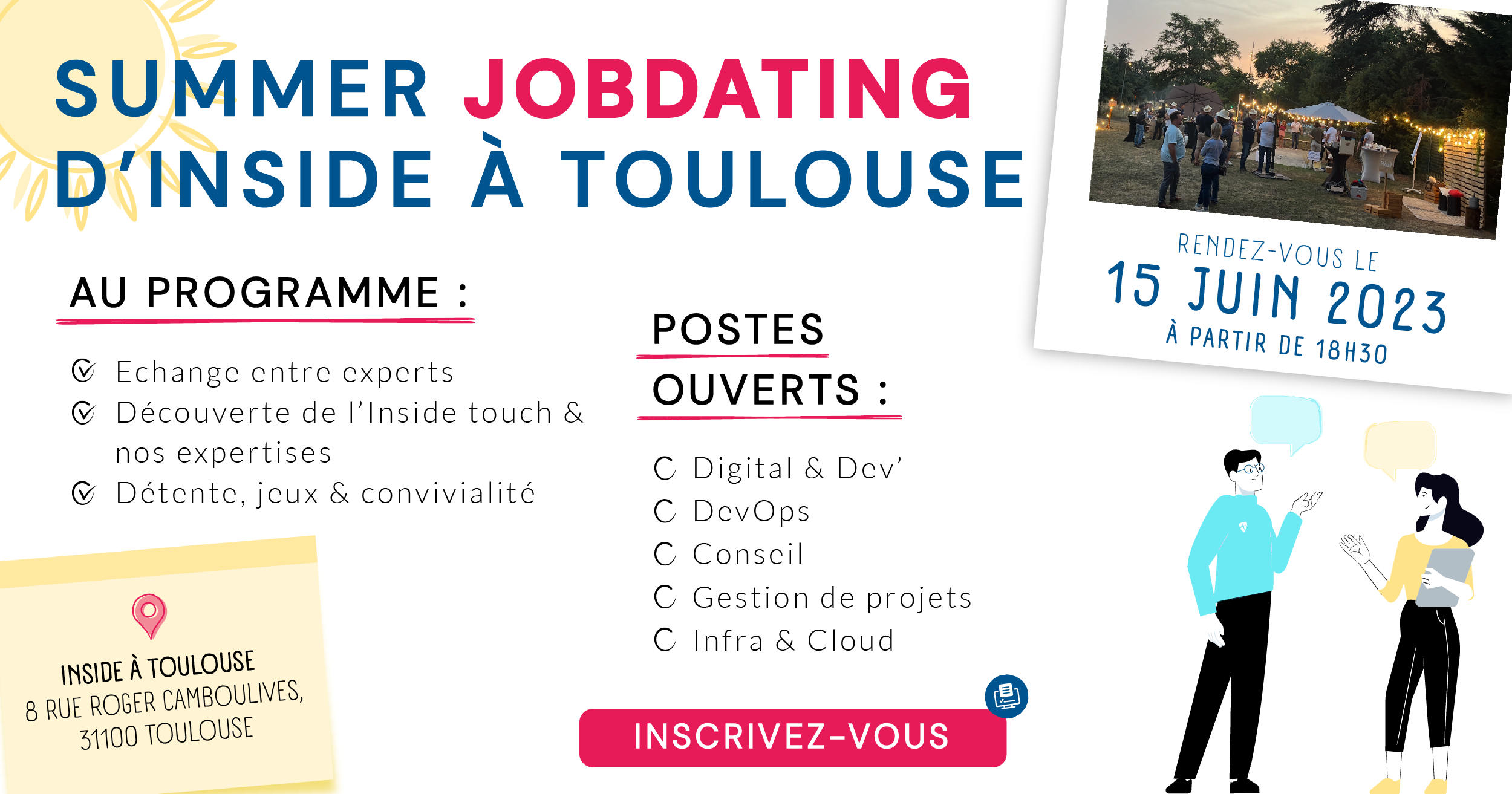 Rendez-vous le jeudi 15 juin à partir de 18h30 dans les locaux d’Inside à Toulouse pour notre Summer Jobdating. Echanges entre pairs, partage de bonnes pratiques et de convictions autour du DevOps, du Craftsmanship et l’Infrastructure… En bref, un moment de partage entre professionnels vous attend !