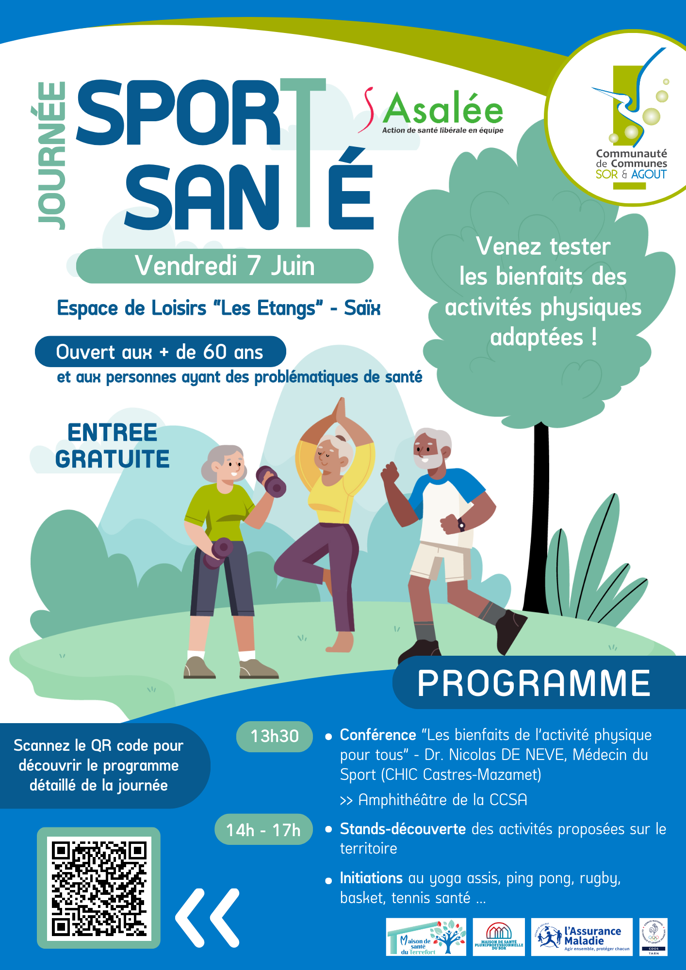 La Communauté de Communes Sor & Agout (CCSA) et les infirmières Asalée du territoire organisent une Journée Sport Santé le vendredi 7 juin 2024 à l’Espace Loisirs « Les Etangs » à Saïx.