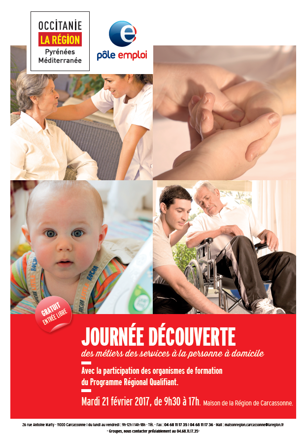 Le mardi 21 février 2017 de 9h30 à 17h00, la Région Occitanie et Pôle Emploi Carcassonne vous proposent de découvrir les métiers de l’Aide à domicile, avec la participation des employeurs et des organismes de formation du département.