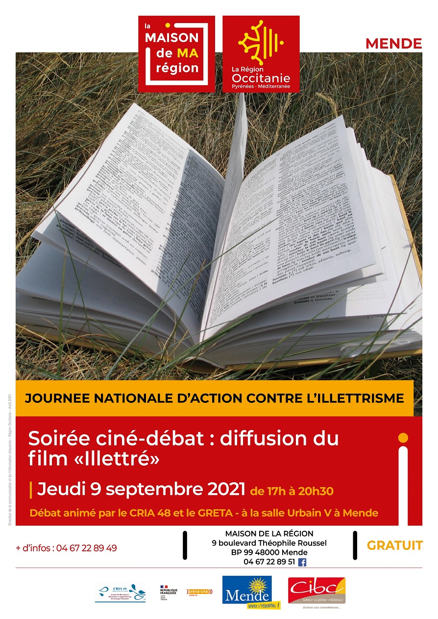 Le CRIA 48- Centre de Ressource Illettrisme Alphabétisation 48, le GRETA-CFA de Lozère, la Région OCCITANIE / Pyrénées-Méditerranée et la ville de Mende proposent une journée inscrite dans le cadre de la semaine des Journées Nationales d’Action contre l’Illettrisme le jeudi 9 septembre 2021 à 17h00.