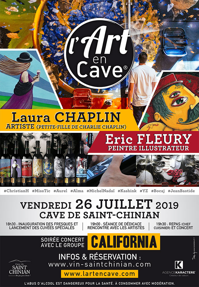 Pour cette édition, Laura Chaplin, petite fille de Charlie Chaplin, et Eric Fleury nous font l’honneur de poser leurs pinceaux sur les murs de la cave !