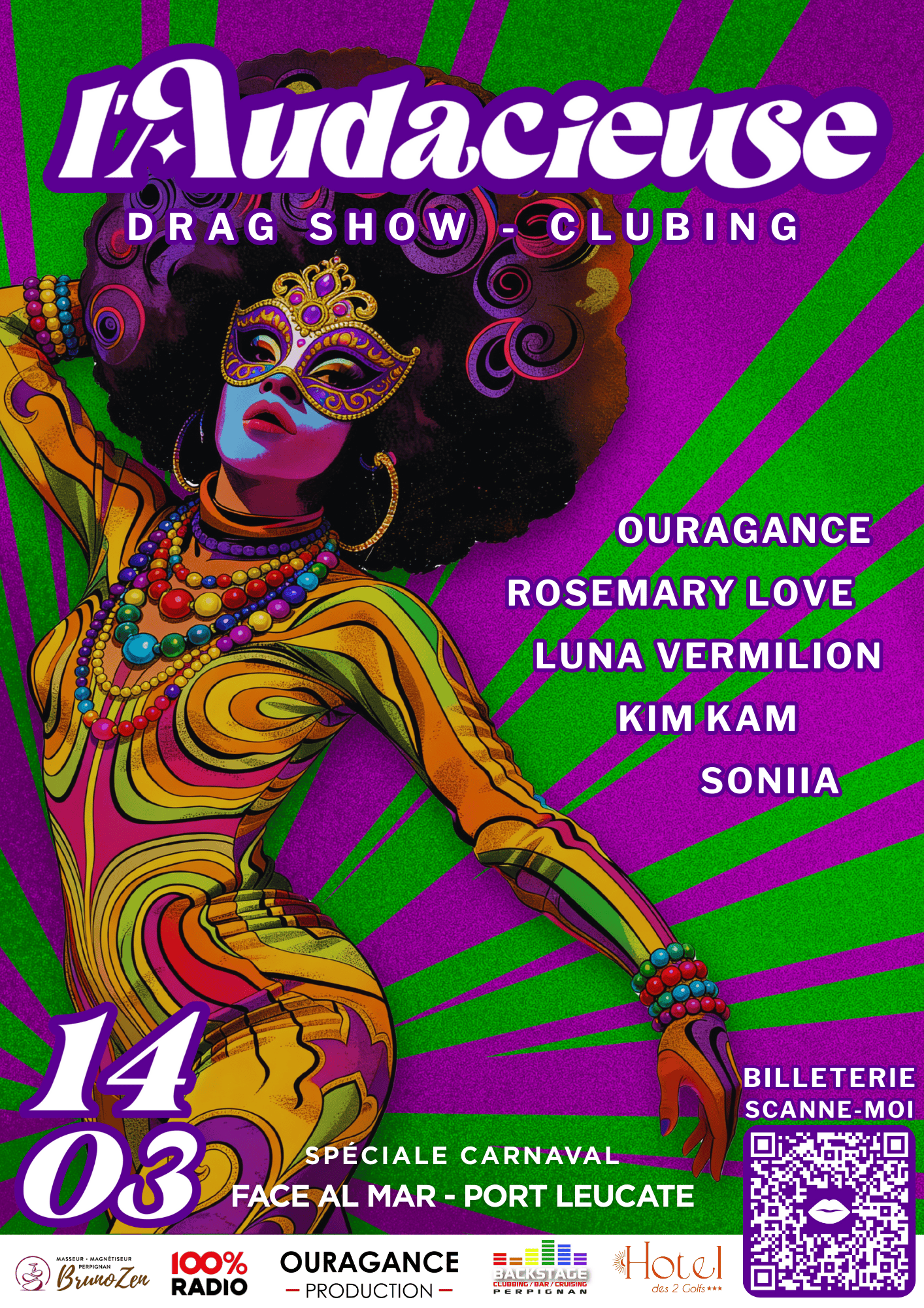 En mars, L’Audacieuse revient en version Spéciale Carnaval : ta soirée entre show et clubbing. 📍 Complexe Face Al Mar (anciennement l’Hacienda) – Port Leucate 🚗 Parking gratuit 🍸 Bar & Restauration sur place 🎟️ Billetterie sur place possibles : 15€ (CB ou espèces)