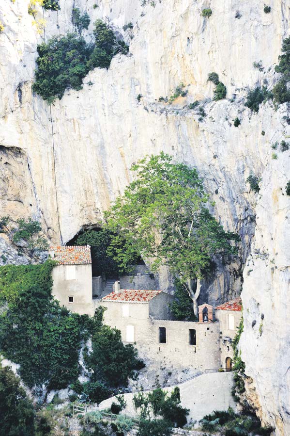 A la frontière de l’Aude et des Pyrénées-Orientales, le défilé de Galamus présente de vertigineuses falaises calcaires (hautes de 500 m) plongeant dans les eaux tumultueuses de la rivière. Une route y a été creusée il y a plus d’un siècle mais l’endroit était habité depuis bien avant. Au VIIe siècle, des ermites s’y étaient déjà installés au fond de grottes enfouies dans la falaise. Au fil du temps, cet endroit magique, suspendu au-dessus du vide, est devenu un lieu religieux plus important. Serti dans la roche, entouré de chênes verts et de genévriers, l’ermitage a conservé sa chapelle et son campanile et offre toujours cet immense sentiment de sérénité que recherchaient ses premiers occupants.