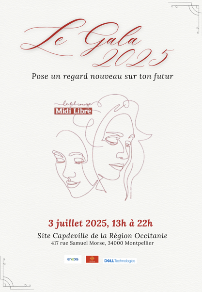 Infos pratiques : Le Fil Rouge Midi Libre a le plaisir de convier à son événement phare de l’année toutes ses adhérentes ainsi que les femmes entrepreneures : le GALA 2025, une journée exceptionnelle placée sous le signe de "POSE UN REGARD NOUVEAU SUR TON FUTUR ".
