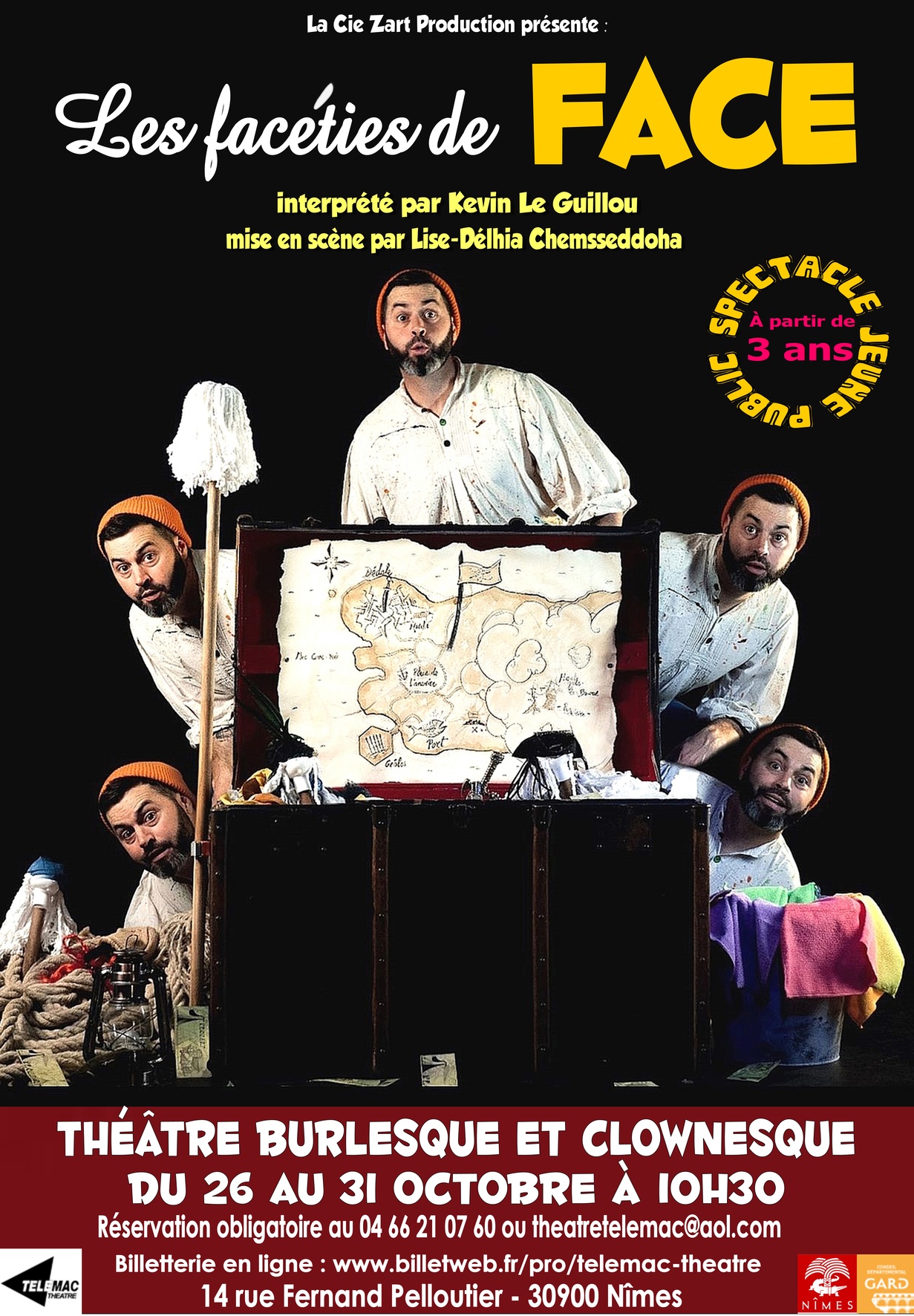 Un spectacle de théâtre clownesque et burlesque pour les 3-6 ans, écrit et interprété par Kevin LE GUILLOU, qui nous raconte les aventures de Face, un moussaillon attachant, dont le propos vient percuter ce qui traverse nos vies à chaque instant : l’amitié, la famille, la solitude, notre place dans la société, nos rêves et nos aspirations…