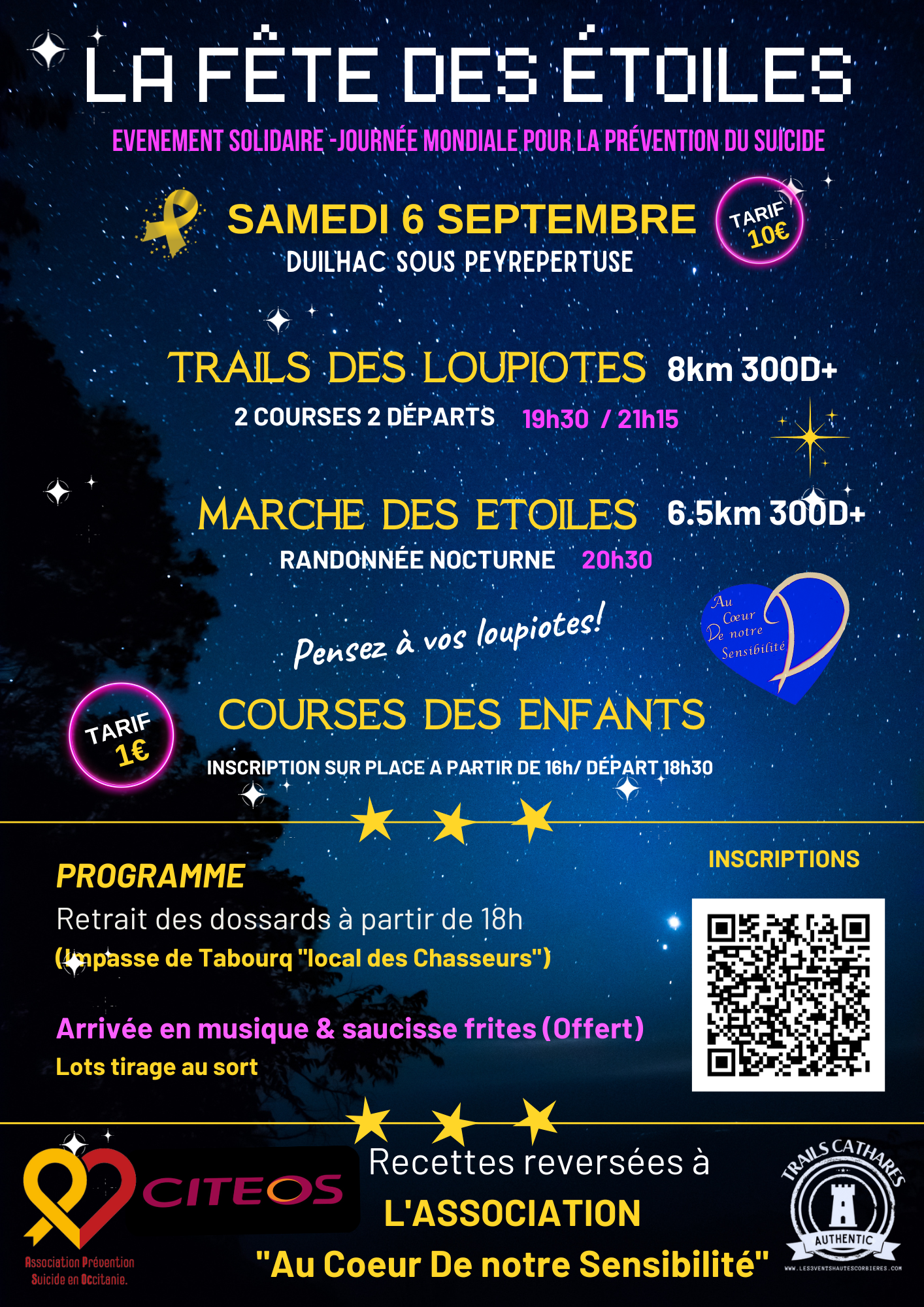 Comme chaque année depuis 4 ans, Au cœur de notre sensibilité, en partenariat avec Aude Trails Cathares, nous nous mobilisons pour mettre en lumière la prévention du suicide avec la Fête des étoiles. Des courses et marches nocturnes, marcher sous et pour nos étoiles partout en France…