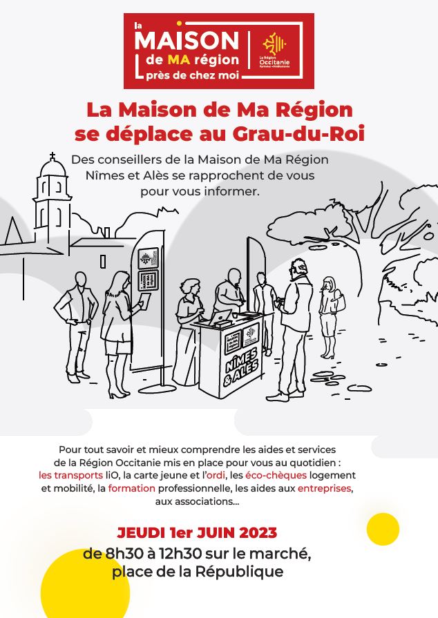 L’équipe de la Maison de Ma Région Nîmes & Alès sera présente près de chez vous, au Grau-Du-Roi jeudi 1er juin pour vous rencontrer, et vous informer sur les aides et dispositifs de la Région mis à votre disposition au quotidien.