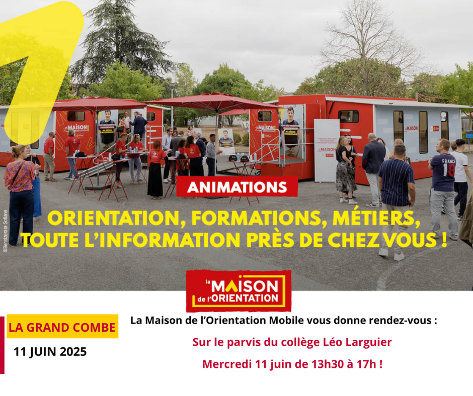 La Maison de l’Orientation Mobile sera sur le parvis du collège Léo Larguier à La Grand’Combe, le mercredi 11 juin de 13h30 à 17h00 pour informer sur l’orientation, les métiers et formations.