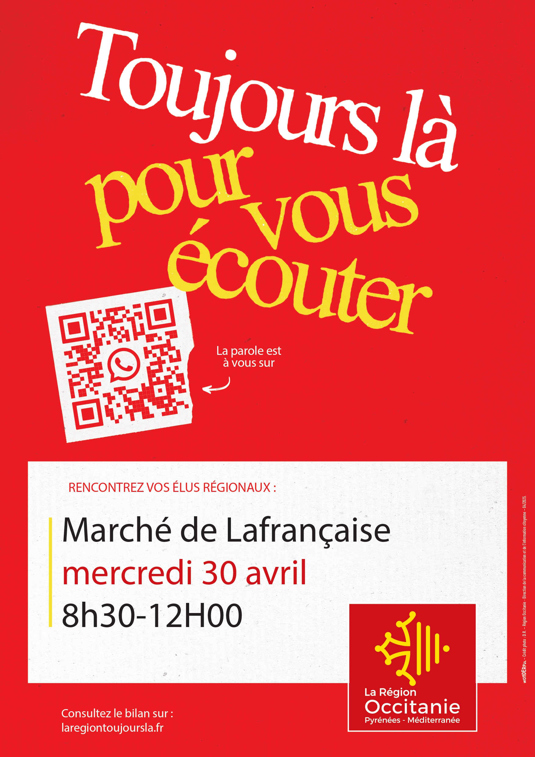 Mercredi 30 avril de 8h30 à 12h au marché de Lafrançaise, venez rencontrer vos élus régionaux et l’équipe de la Maison de ma Région de Montauban pour échanger avec eux et vous renseigner sur :