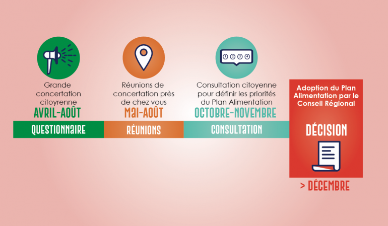 - De décembre 2017 à février 2018, les thèmes et objectifs de cette concertation régionale ont été abordés et décidés par les élus régionaux en lien avec les acteurs du domaine alimentaire et des experts (associations de consommateurs, etc…).
