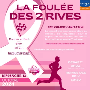 Notre club 2 Rives, organisation un évènement sportif avec plusieurs courses pédestres. Nous sommes en partenariat avec la ligue contre le cancer de Toulouse et différentes mairies : Roquettes, Pins-Justaret, Saubens, Villates. Cet évènement s’inscrit dans le programme du week-end "Occitanie Soins Solidaire" qui a pour vocation de développer le sport-santé sur le territoire Occitan.