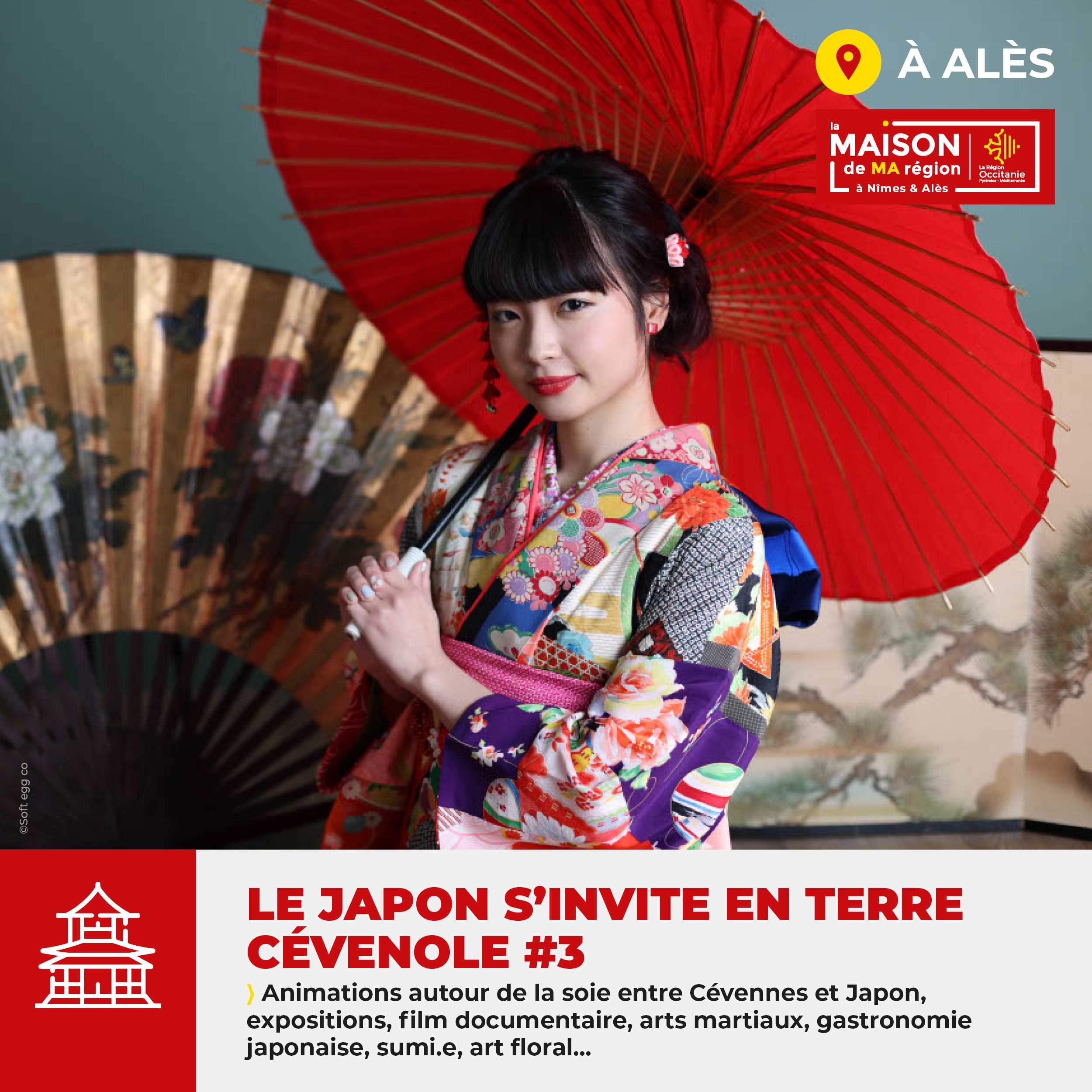 - Le 10 novembre à 14h30 à Maison Rouge - Musée des vallées cévenoles à Saint-Jean-du-Gard : La projection sera suivie d’un défilé de mode aux couleurs du monde inspiré des kimonos japonais revisités "Hybrides Textiles et Soie" par Juliana Anjavola, en collaboration avec Bertrand Wolff Musicien créateur de son avec une composition de musique entre acousmatique et l’électronica, et de Chiharu MAMYA danseuse chorégraphe. C’est un bouquet en ikebana qui vous accueillera à l’entrée de la salle des conférences préparé par Anne Roussel : « Au Japon on n’étudie pas un art pour l’amour de l’art mais pour les clartés spirituelles qu’il dispense, un temps d’écoute à soit même en lien avec les autres ». C’est cela l’ikebana. (Gratuit sur réservation au 04 66 85 10 48 - maisonrouge@alesagglo.fr)