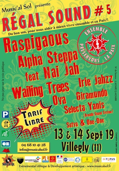 RDV donc les 13 et 14 septembre prochains pour LE rendez-vous de Music’al Sol qui explore les mondes musicaux Reggae – Dub – World et qui soutient les gens qui militent pour Préserver la Paix, en l’occurrence nos partenaires du Mouvement de la Paix Audois et d’Amnesty International !!