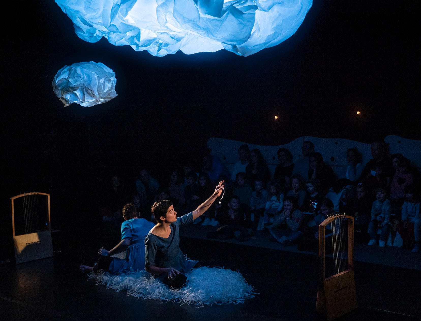 Une rencontre contemplative, comme une fenêtre ouverte sur l’imaginaire, les sons, les images qui nous entourent. Tout comme l’enfant construit son univers et apprend une chose après l’autre, pas à pas, le musical se fabrique petit à petit, partant d’un rien pour arriver à un tout. Le ciel est par-dessus le toit explore cette construction, la découverte de la voix nue, d’un matériau sonore brut, puis d’un son plus défini avant l’expérience de la formation d’une mélodie, d’un mot, d’une phrase, d’un tableau sonore ou d’une chanson. Une forme immersive pour l’émerveillement simple d’un ciel par-dessus un toit, par-dessus une maison, par-dessus nos têtes, … par-dessous une infinité de découvertes.