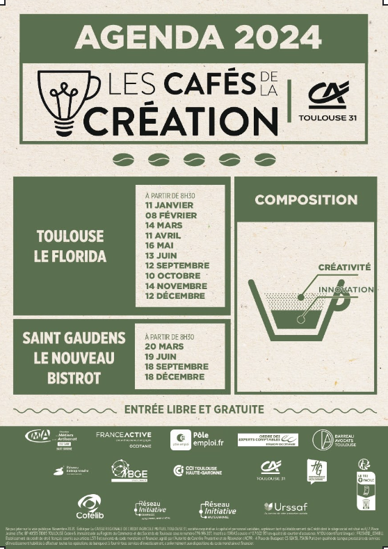 Organisés par le Crédit Agricole Toulouse 31, les Cafés de la Création sont des rencontres conviviales et informelles avec différents partenaires de la création d’entreprise : experts comptables, avocats, conseillers bancaires, représentants de la CMA, des réseaux d’accompagnement Entreprendre, France Active…