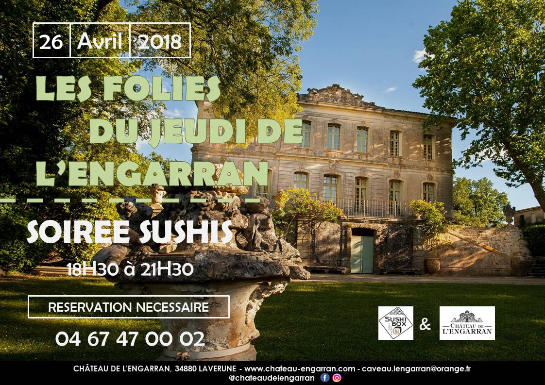 C’est le début du printemps, le jardin reprend vie ! C’est au Petit jardin que nous entamons la saison avec une Folie du Jeudi « Spécial Sushi ». Les vins du Château de l’Engarran seront accordés avec les créations du Food Truck Sushi Box. Toute l’actualité de nos évènements sur notre page Facebook.