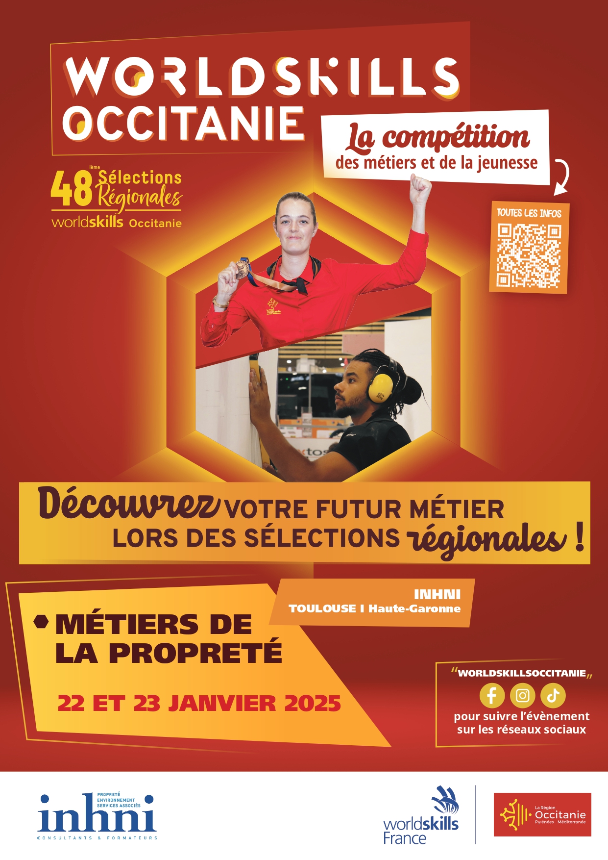 Les Sélections Régionales Worldskills Occitanie pour "les Métiers de la Propreté" auront lieu les 22 et 23 janvier 2025, à l’INHNI de Toulouse. Elles seront organisées en parallèle de la Journée Information Métiers, de la Journée Portes-Ouvertes de l’établissement, au cours de laquelle il vous sera également possible de visiter les plateaux techniques.